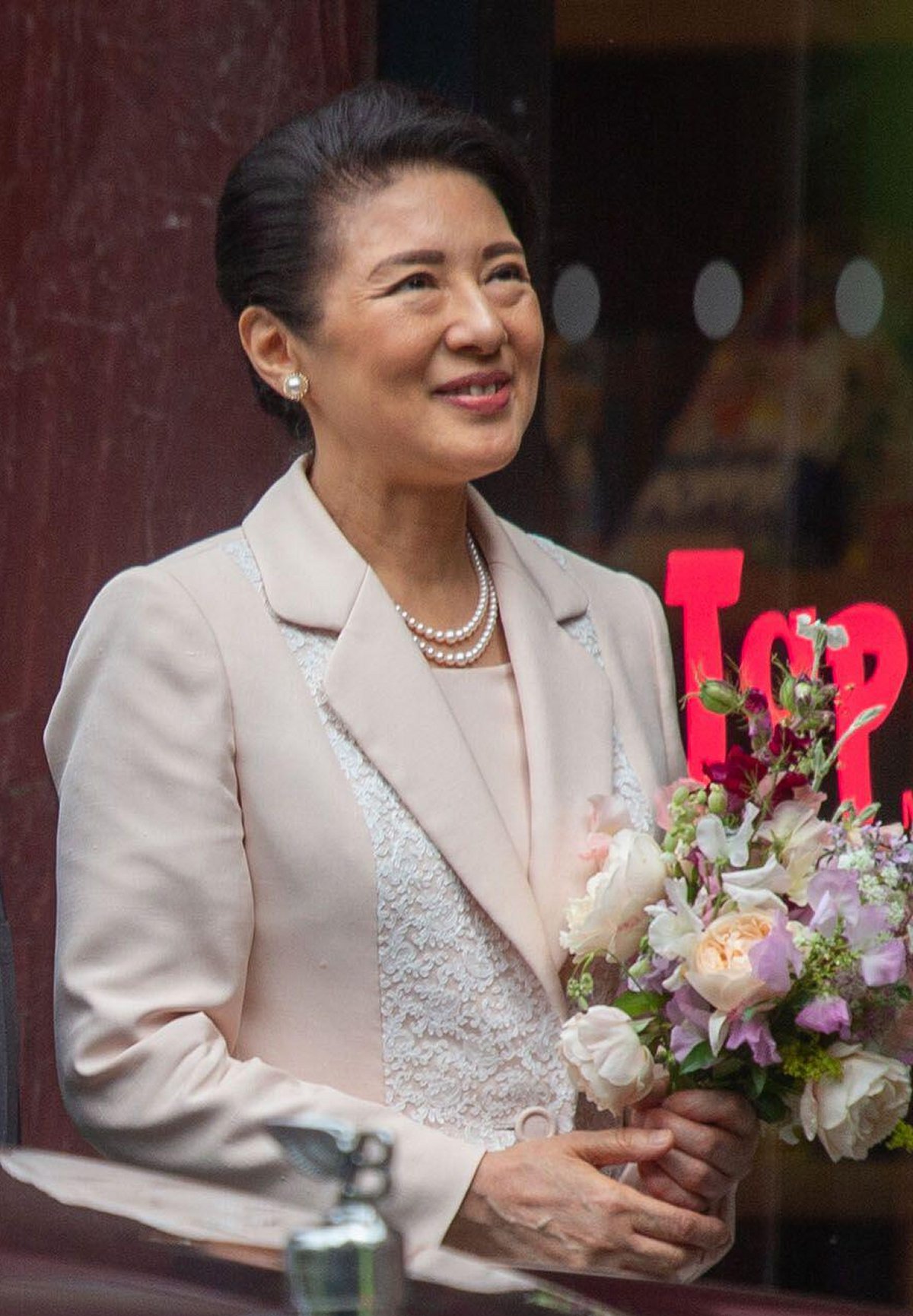 Speaking of Masako, she wore a blush-colored ensemble with white lace accents for engagements on Thursday, including the stop at Buckingham Palace and a visit to view the “Japan: Myths to Manga” exhibition at the Young V&A. As usual, she accessorized with elegant pearl jewelry, including button-style earrings with diamond halos and a double row of pearls.