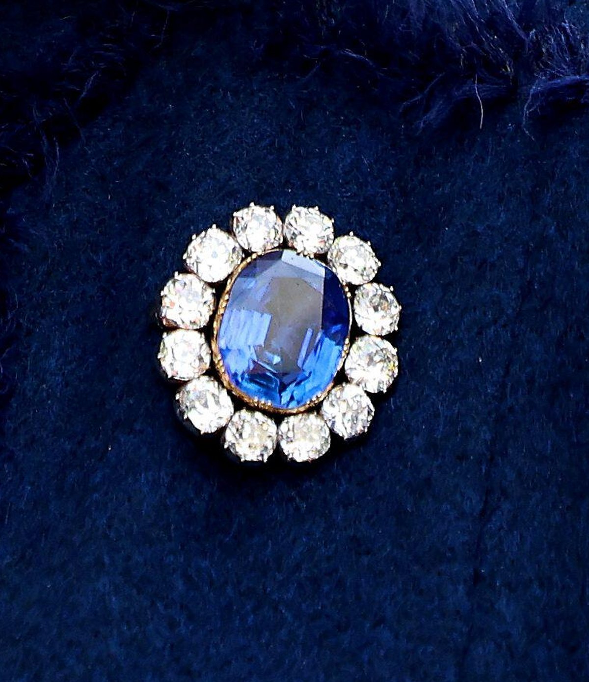 Prince Albert’s Brooch, as it is usually known, features a large sapphire surrounded by a cluster of twelve round diamonds, all set in gold. The jewel was likely made in the Netherlands.