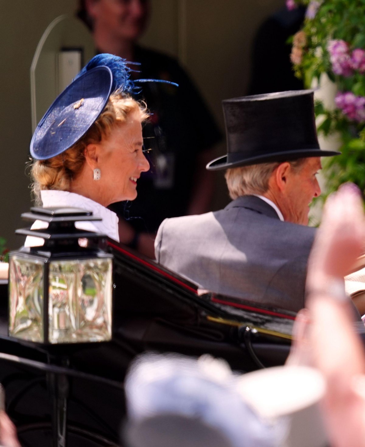 In the third carriage were the Earl and Countess of Halifax with Annabel Eliot and her son, Sir Ben Eliot. (These are members of the Queen’s family: Lady Halifax and Queen Camilla were sisters-in-law when they were married to two of the Parker Bowles brothers, and Annabel and Sir Ben are Camilla’s sister and nephew.) The fourth carriage ferried Sir Johnny Weatherby (formerly Queen Elizabeth II’s representative at Ascot) and Lady Weatherby, with the trainer Ralph Beckett and his wife, Isabelle, to the racecourse.