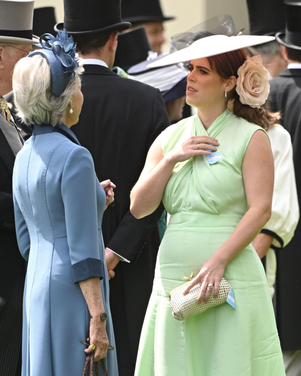 Also on hand to watch the races were the Duke and Duchess of Gloucester, fresh off her installment as the newest royal lady of the Order of the Garter yesterday at Windsor Castle. She wore elegant pearls and diamonds for the races. Here, she’s chatting with Princess Eugenie, who is wearing her diamond and emerald wedding earrings.