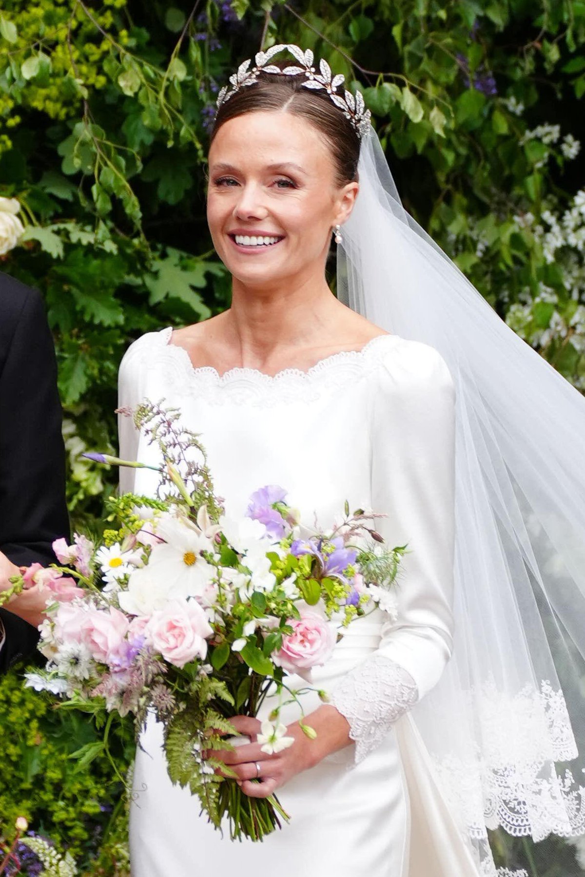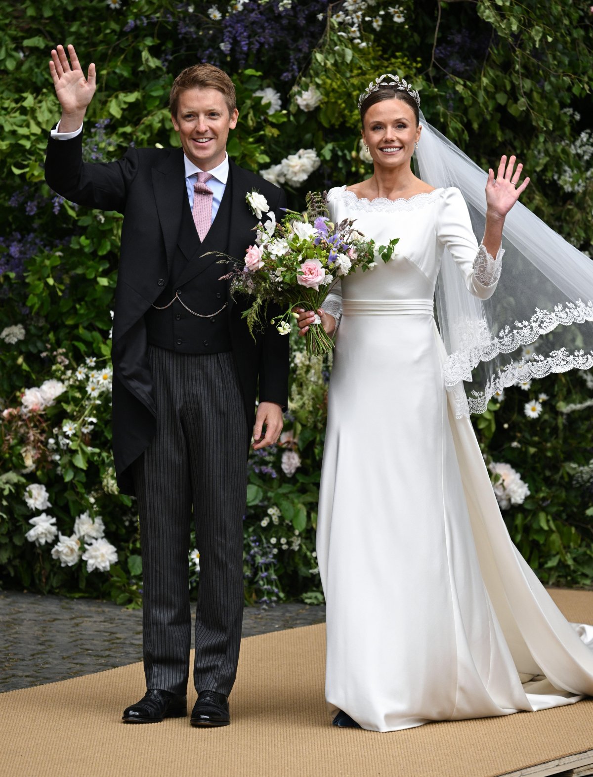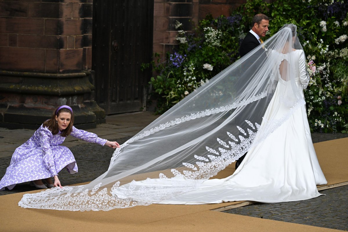 After a year-long engagement, Hugh and Olivia were married on Friday at Chester Cathedral, which is located near the family’s country seat, Eaton Hall, in Cheshire. For the ceremony, Olivia wore a bridal gown by a British designer, Emma Victoria Payne. The dress featured “bespoke embroidery” that incorporated “floral motifs and edgings” from an antique nineteenth-century veil that belonged to Olivia’s great-great-grandmother, Lady Geraldine Hervey. From what I gather, Olivia isn’t wearing the actual veil from the 1880s, but rather a new gown and veil featuring motifs inspired by the antique veil.