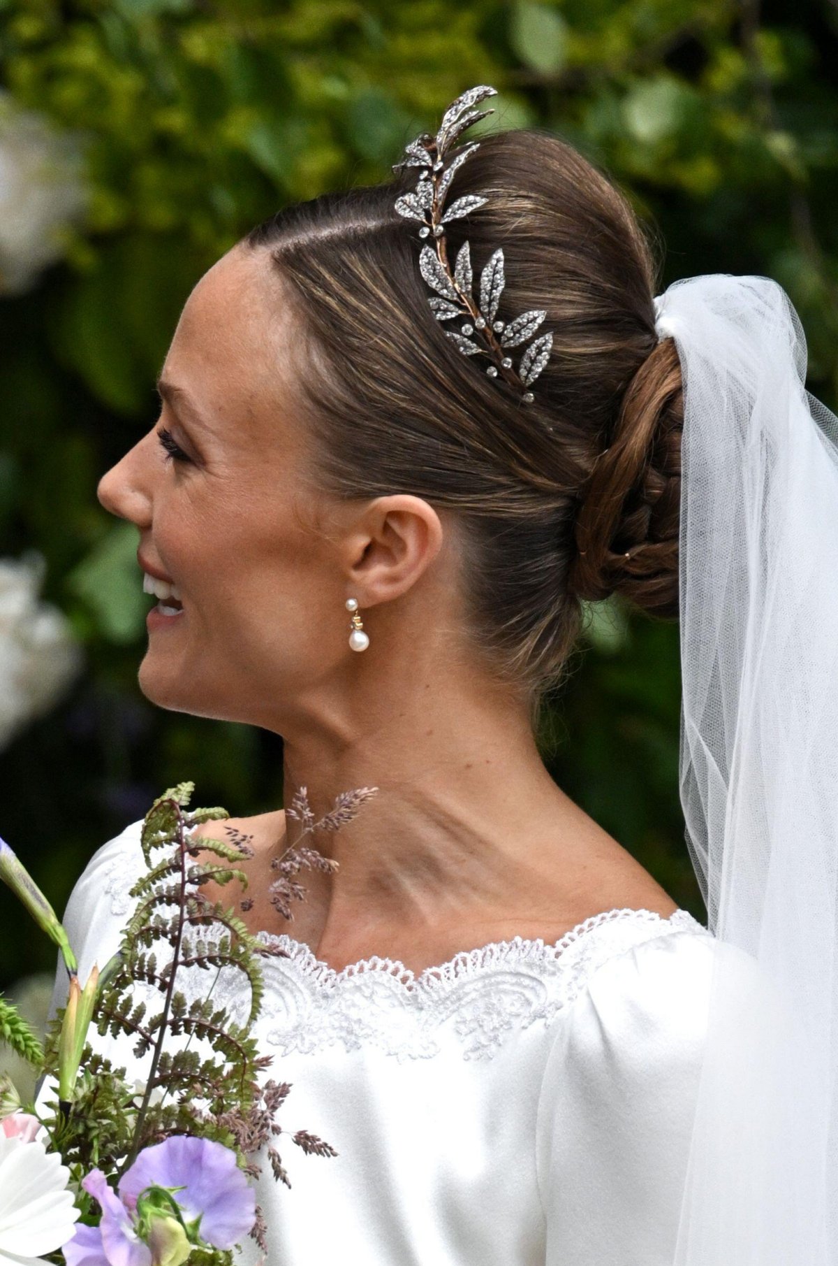 Here’s another look at the way that the new Duchess of Westminster styled the antique diamond tiara on her wedding day. Olivia’s hairstyle was designed to provide a backdrop for the tall tiara. She also added a pair of classic diamond and pearl earrings to complete her bridal jewelry look.