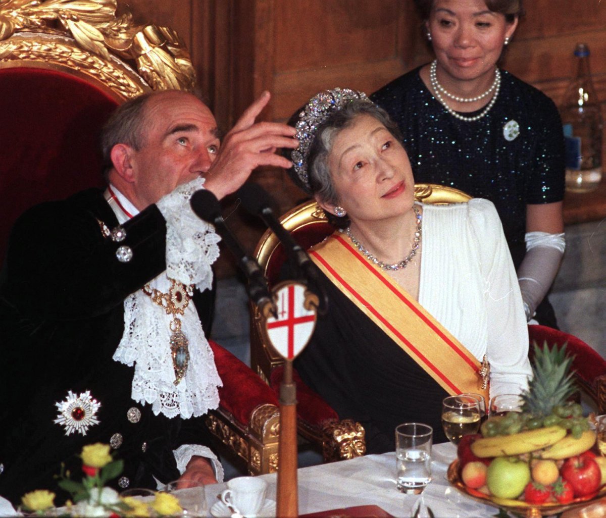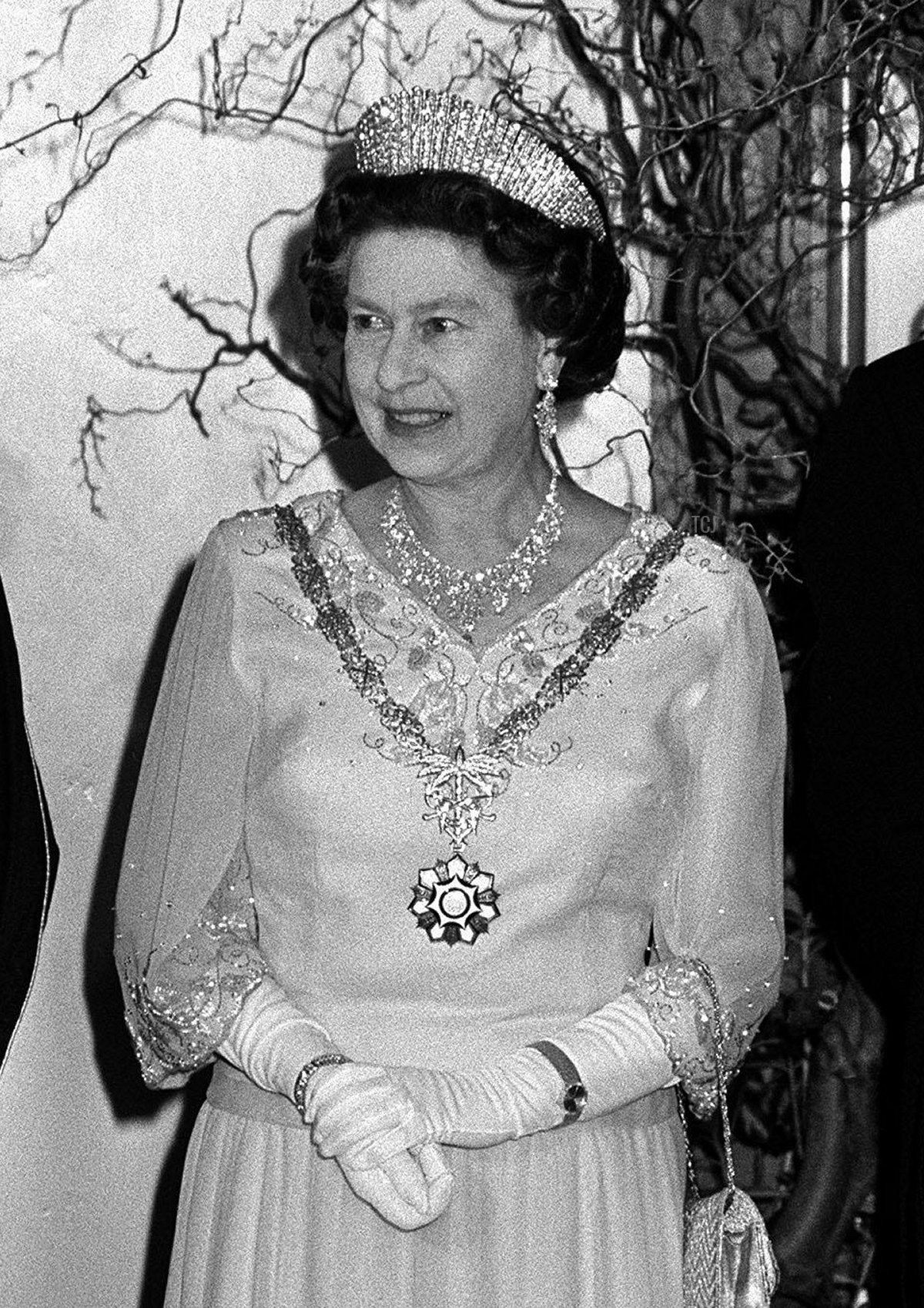 During the last Japanese state visit to Britain, Empress Michiko wore the tiara on a pair of occasions. First, she wore it for the state banquet at Buckingham Palace.