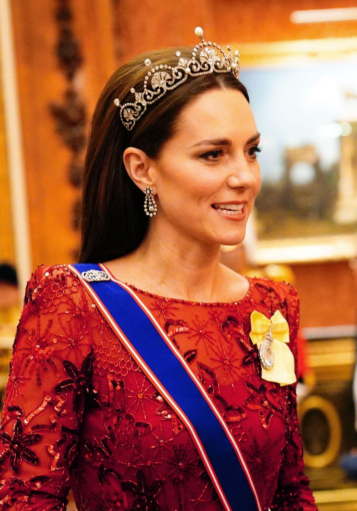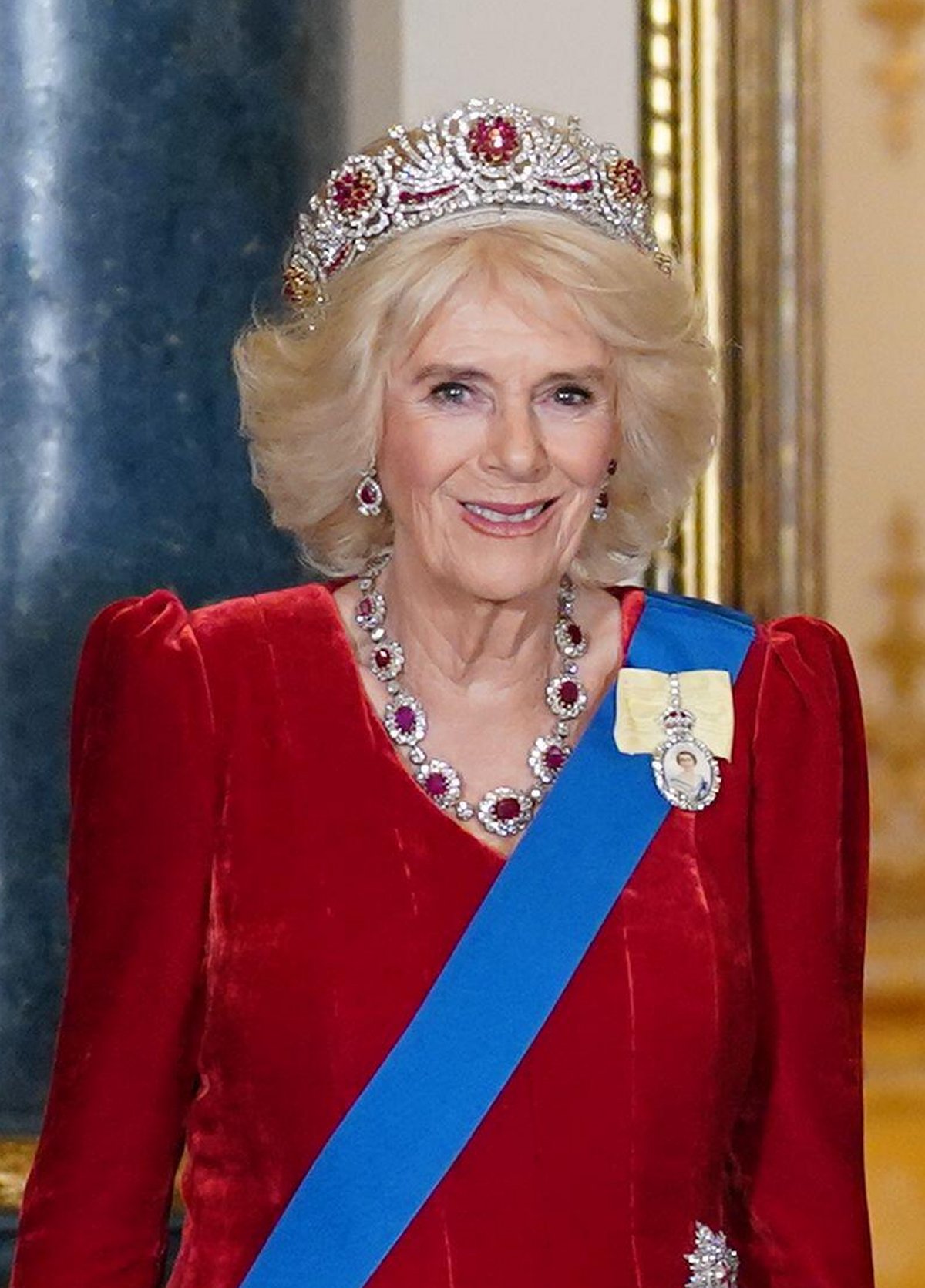 Queen Camilla first wore the ruby and diamond tiara in public in November 2023 during a state banquet at Buckingham Palace given in honor of the President of South Korea. She paired it with the Crown Ruby Necklace and ruby and diamond earrings from her personal collection.