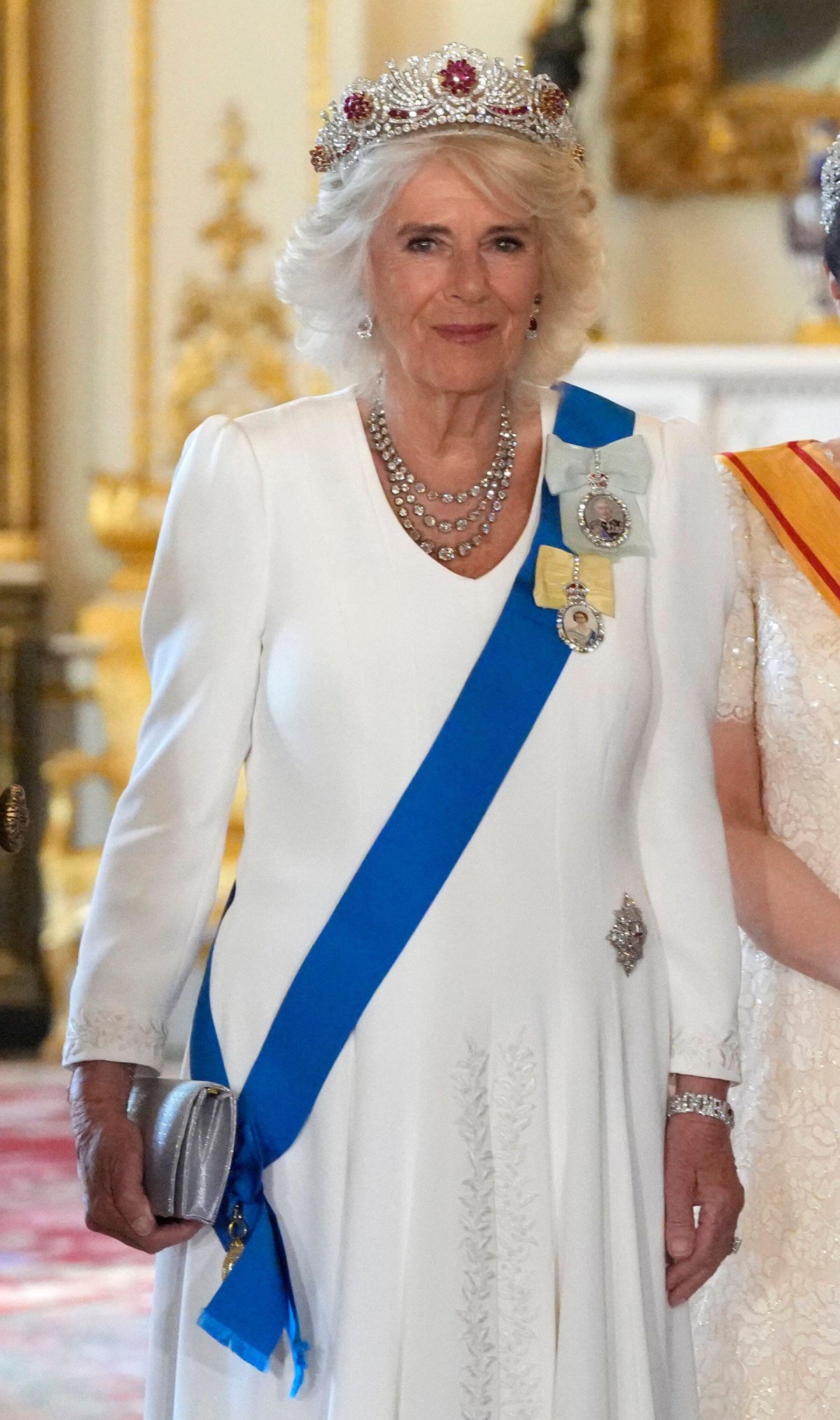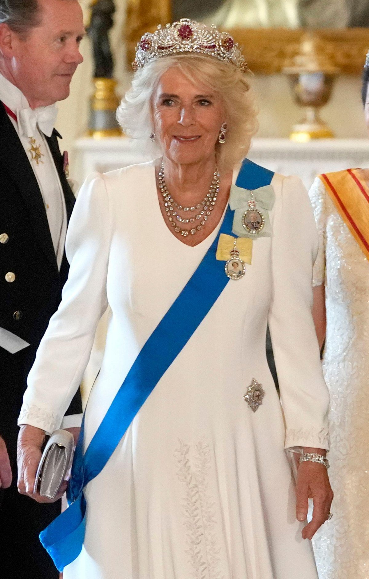 Rows of diamonds were also part of Queen Camilla’s jewelry ensemble for the evening. She wore a three-stranded diamond necklace with the Burmese Ruby Tiara, a diadem personally commissioned by the late Queen Elizabeth II.