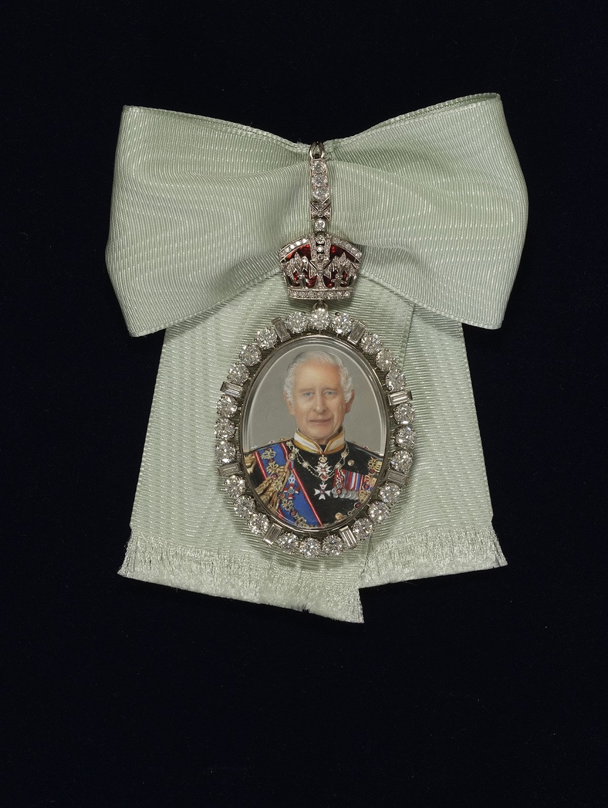 There was also another new decoration featured at the banquet: the debut of King Charles III’s Royal Family Order. So far, Queen Camilla is the only wearer of the ribbon and badge. The portrait of the King was painted by Elizabeth Meek, based on a photograph taken last year by Hugo Burnand. The miniature was painted on a synthetic plastic material called polymin instead of ivory.