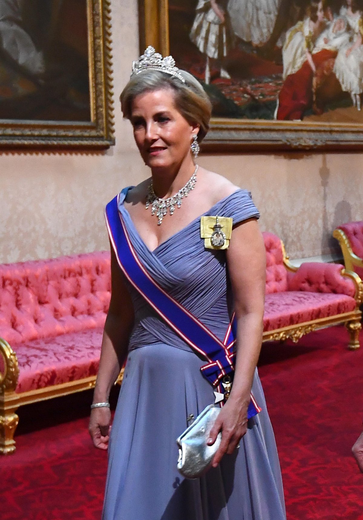 Sophie wore the Lotus Flower Tiara with a suite of jewelry that she has worn in the past. The demi-parure of diamond jewelry, featuring small pear-shaped diamond drops, arrived in the late Queen Elizabeth II’s collection in the 1980s. It’s speculated that the set may have been a gift from King Fahd of Saudi Arabia, perhaps presented to Elizabeth II during his state visit to Britain in 1987. She wore the diamonds for the first time in public during the visit’s return banquet.