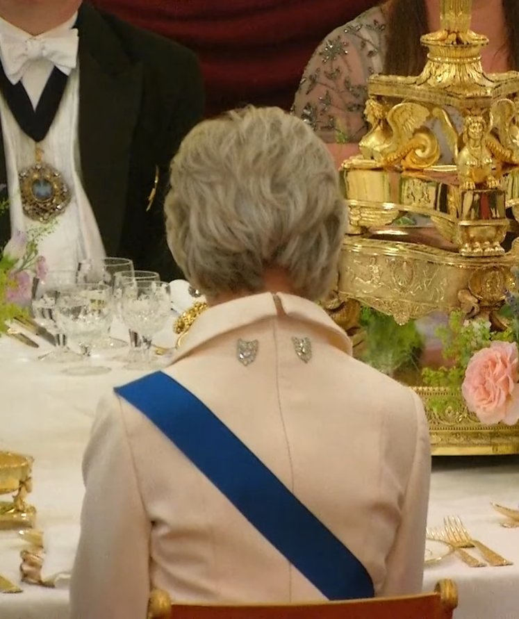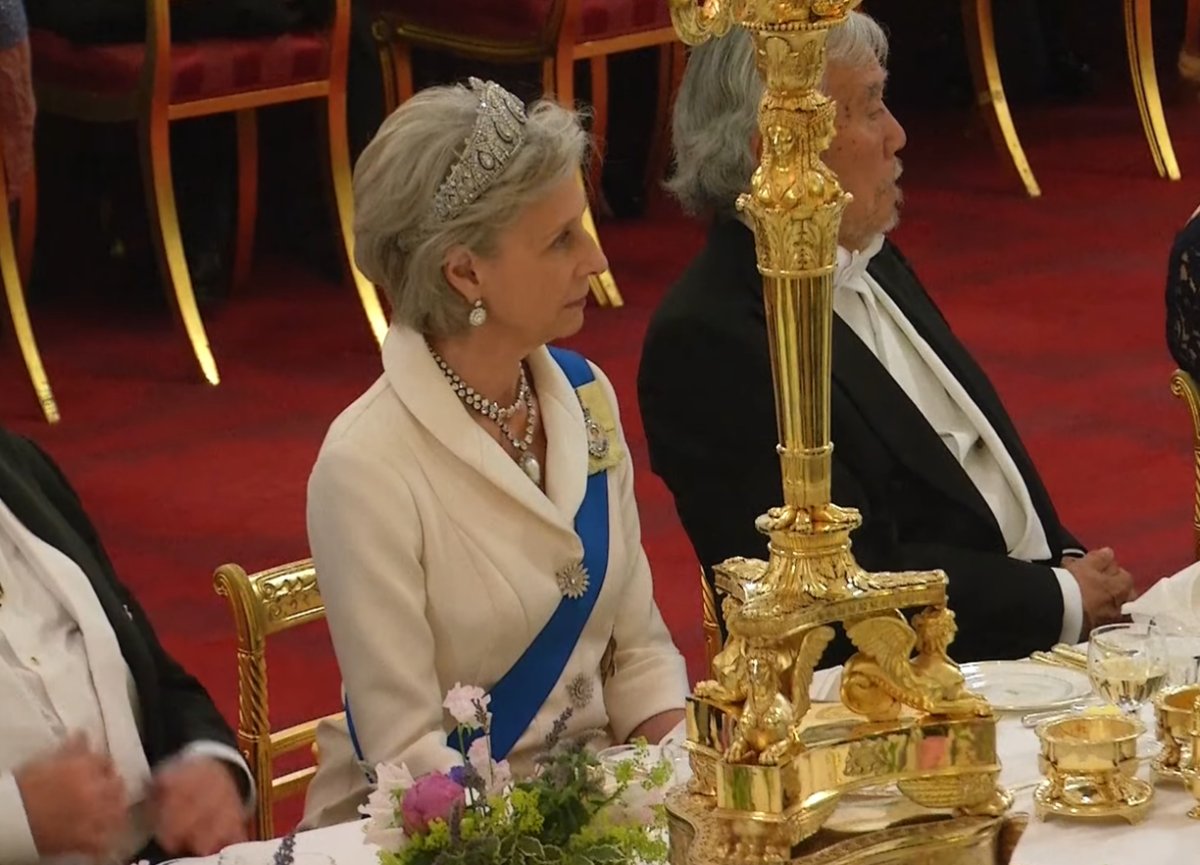 There was one more dazzling royal lady in attendance at the banquet: the Duchess of Gloucester, who was resplendent in diamonds, pearls, and sapphires from her personal collection. She wore the magnificent Cartier Indian Tiara with diamonds and pearls that belonged to her late mother-in-law, Princess Alice, Duchess of Gloucester. I particularly like how she’s used her diamond floral brooches as “buttons” on her outfit.