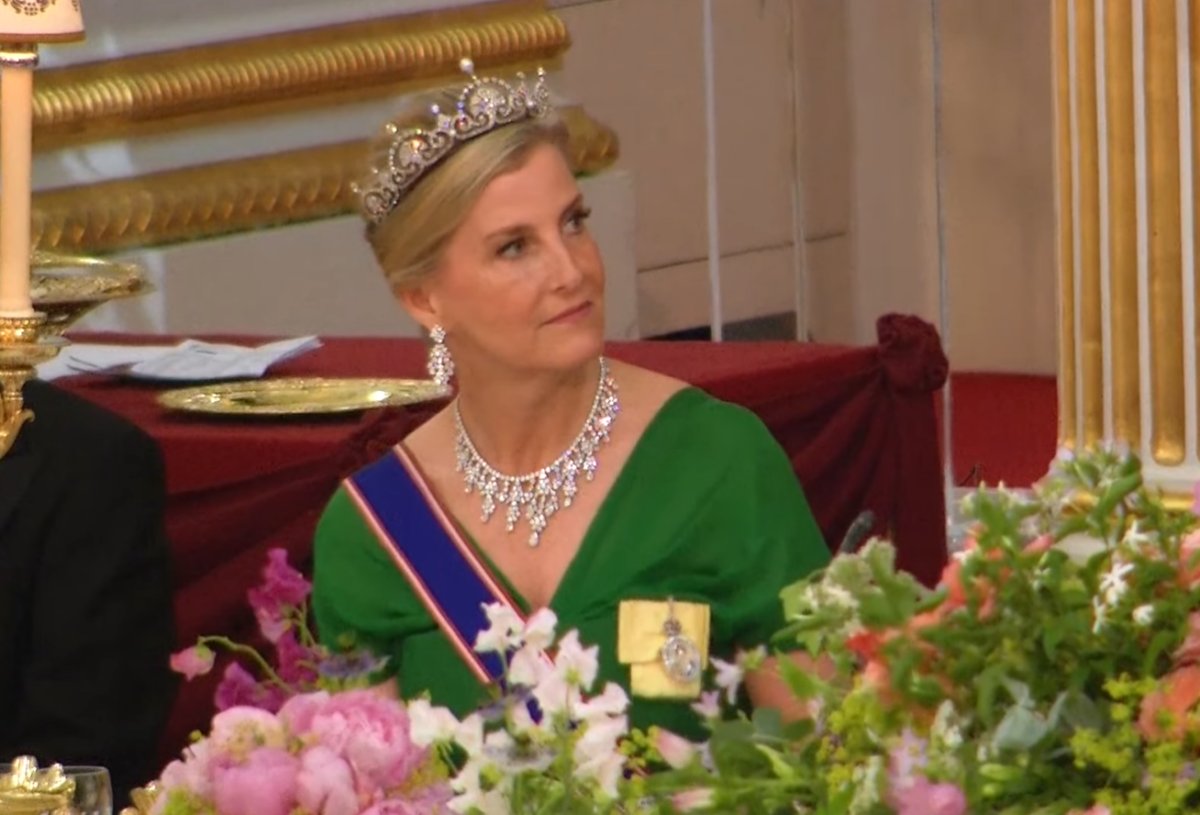 Sophie was also dazzling in diamonds for the banquet, all pieces on loan from the royal vaults. She wore the Lotus Flower Tiara with the late Queen’s Pear-Shaped Diamond Drop Demi-Parure for the banquet. Significantly, the palace briefed that the jewels were loaned to Sophie “by Queen Camilla,” suggesting that the new Queen (like many consorts before her) is now in charge of the jewelry collection herself.