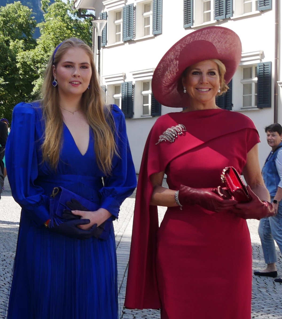 Delightfully, Princess Amalia also brought along some dazzling jewelry to wear for the religious wedding ceremony. With her royal blue ensemble, she wore Queen Maxima’s diamond and tanzanite earrings. Amalia wore the same diamond and tanzanite pendants on a longer chain last year for Prinsjesdag.