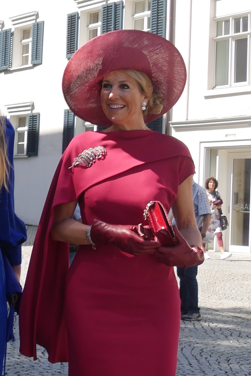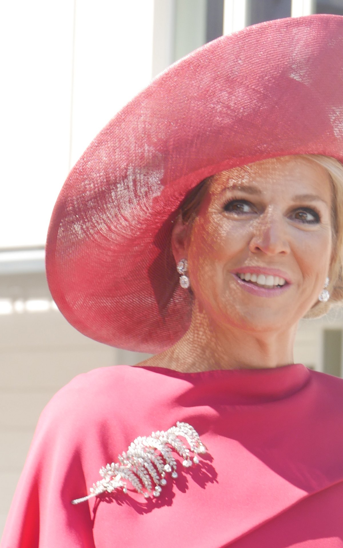 Queen Maxima was elegant in raspberry and diamonds for the Austrian wedding, wearing diamonds with family and sentimental history. She called back to her own wedding day in 2002, wearing the same diamond bracelet that she wore for her civil and religious wedding ceremonies that February. She also wore a pair of diamond rosette earrings from the family collection with a pair of diamond drops. (Princess Alexia wore the same earrings last year for Prinsjesdag.) We recently saw Maxima wear the floral studs with pearl drops during a trip to the Philippines.