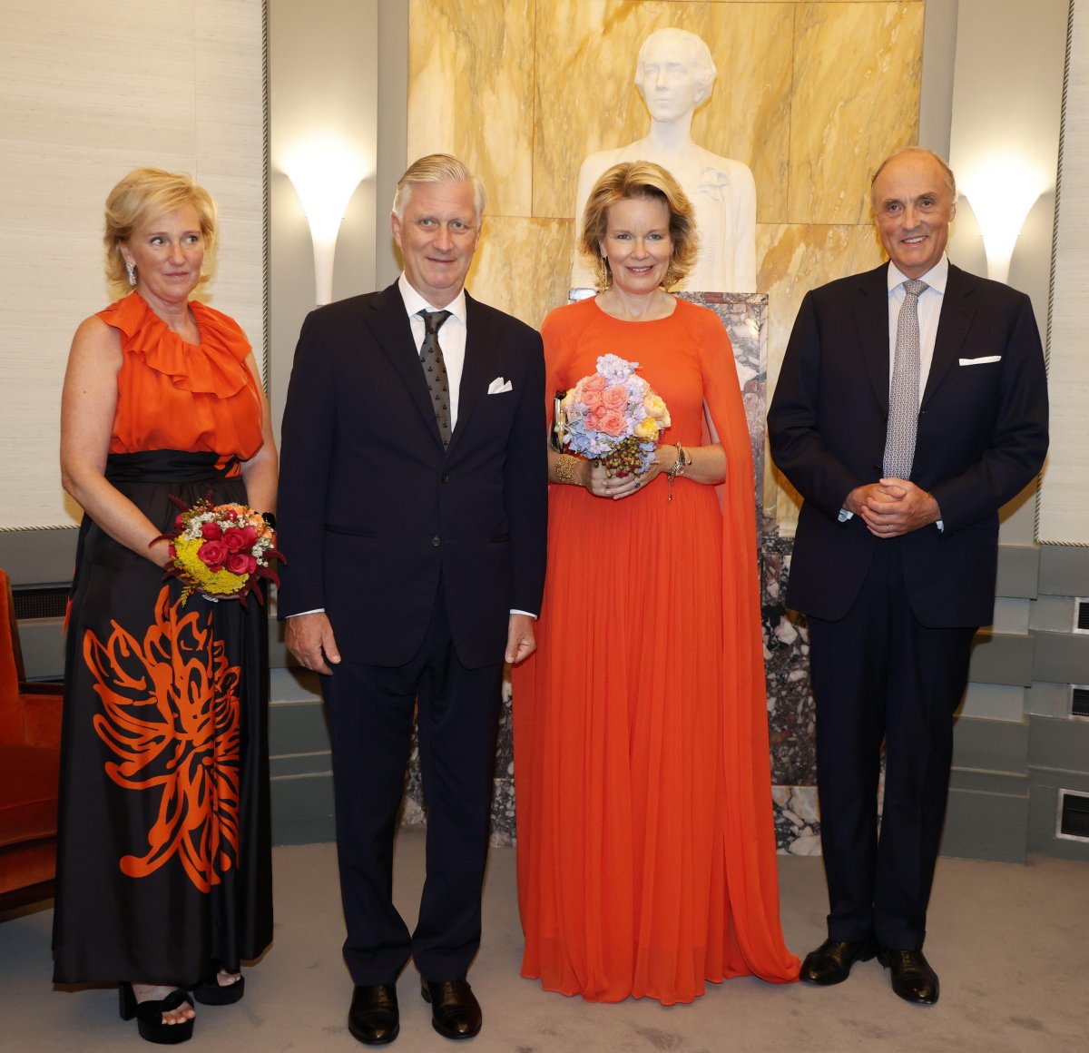 On Saturday, the King and the Queen of the Belgians were joined by his sister and brother-in-law, Princess Astrid and Prince Lorenz, at the Bozar in Brussels for a concert on the eve of National Day. The royal couples posed in front of a bust of King Philippe and Princess Astrid’s great-grandmother, Queen Elisabeth, ahead of the concert.