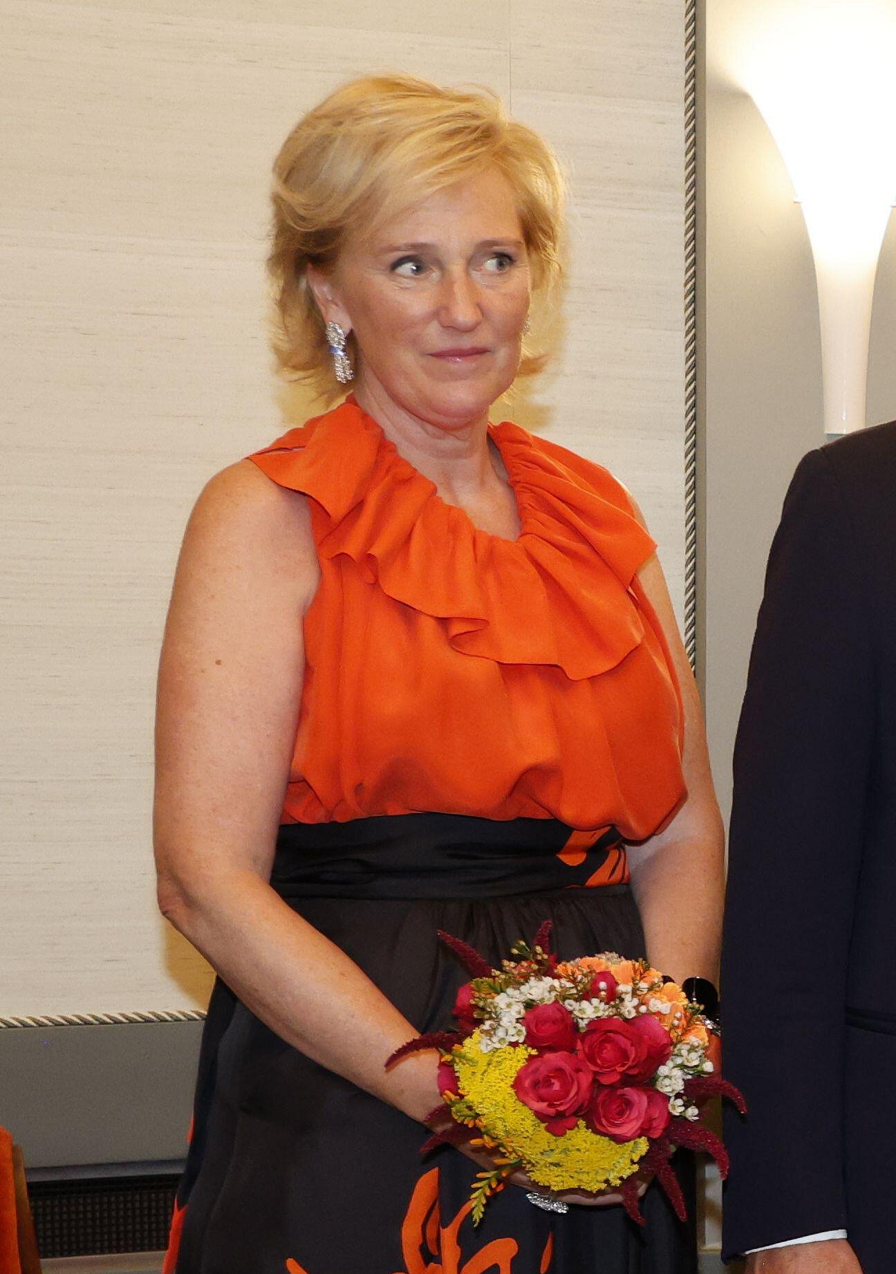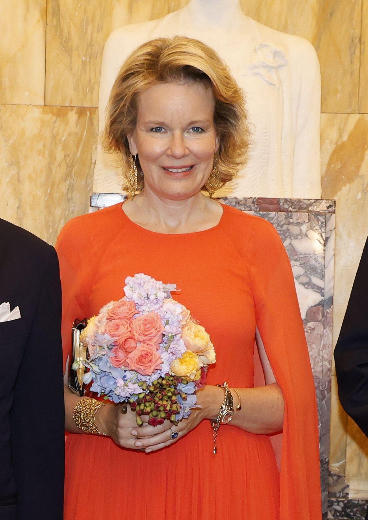 Both Queen Mathilde and Princess Astrid wore eye-catching orange for the concert. Mathilde opted for an orange gown from the brand Essentiel Antwerp, featuring elegant cape-like sleeves. (Her daughter, the Duchess of Brabant, wore the same gown in fuchsia pink for the royal wedding in Jordan last June, while the Princess of Orange wore the same gown in royal blue to celebrate the birthday of Crown Prince Christian of Denmark in October.) Mathilde accessorized with gold filigree jewelry from her collection.