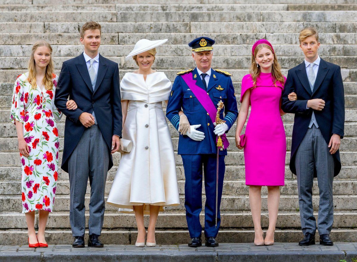 On Sunday, King Philippe and Queen Mathilde were joined by their four children–from left to right here, Princess Eleonore, Prince Gabriel, the Duchess of Brabant, and Prince Emmanuel–for the traditional Te Deum service at the Cathedral of St. Michael and St. Gudula in Brussels.
