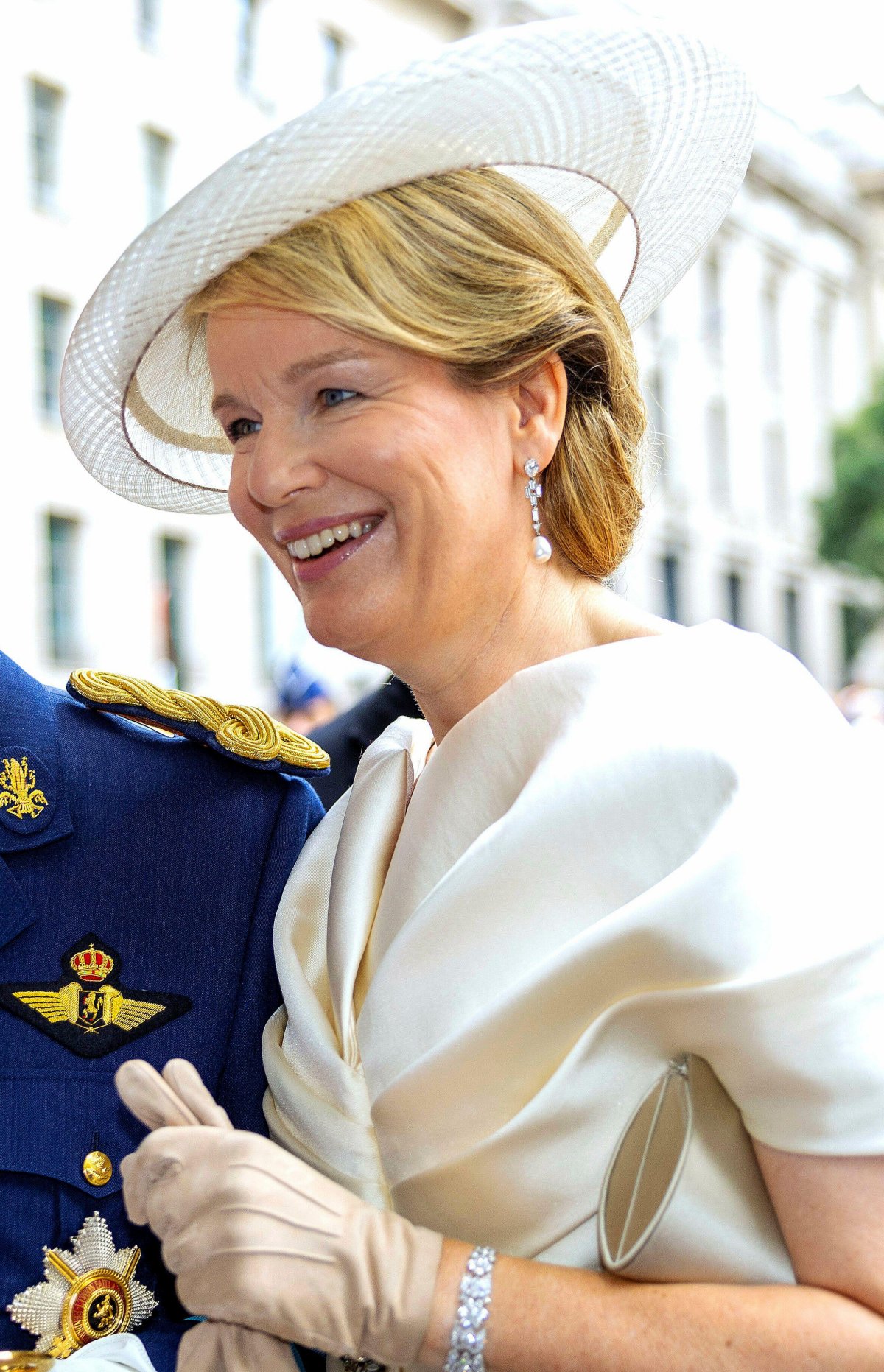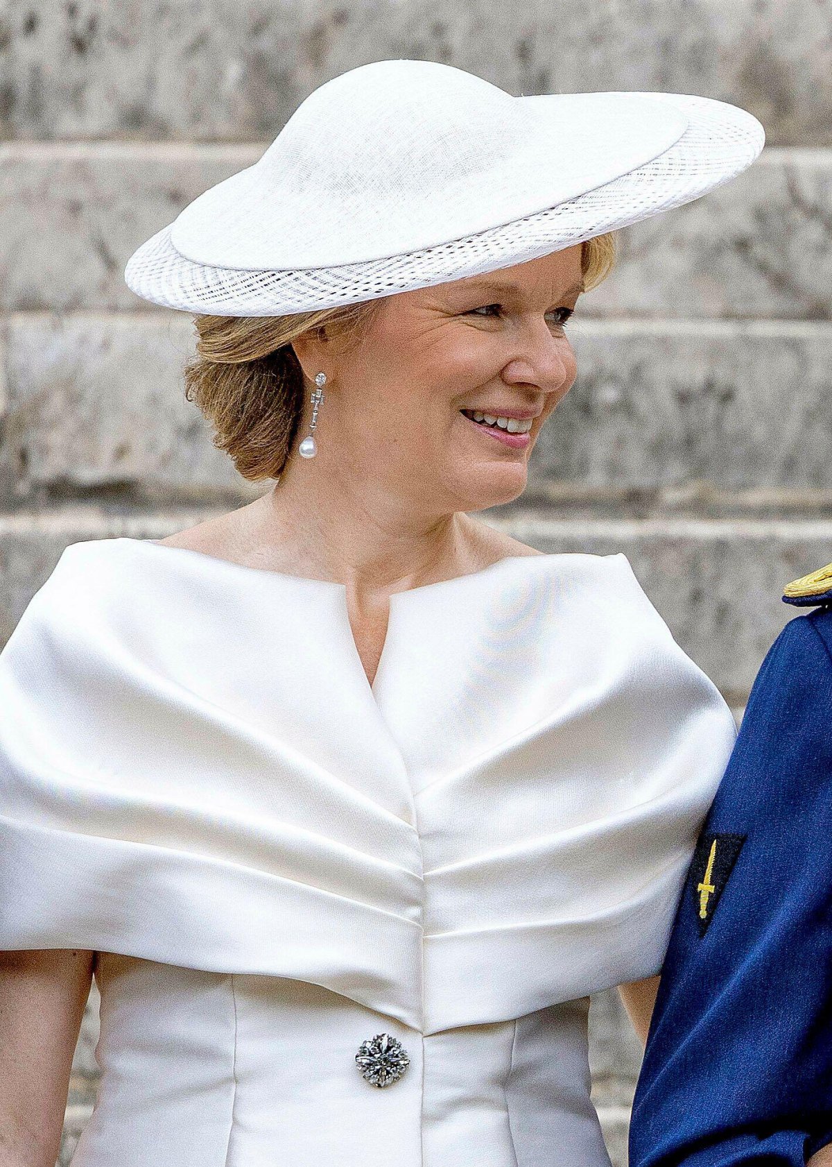 With a dress from a favorite royal designer, Natan, Queen Mathilde wore a special pair of heirloom diamond and pearl drop earrings. The jewels previously belonged to King Philippe’s beloved aunt, Queen Fabiola, who was Queen of the Belgians from her royal wedding in 1960 until the death of her husband, King Baudouin, in the summer of 1993. The earrings were among Fabiola’s most-worn pieces of jewelry. King Philippe was extremely close to his uncle and aunt, and Queen Mathilde has worn several pieces of Fabiola’s jewelry since her passing in 2014, including these earrings and the Wolfers Tiara.