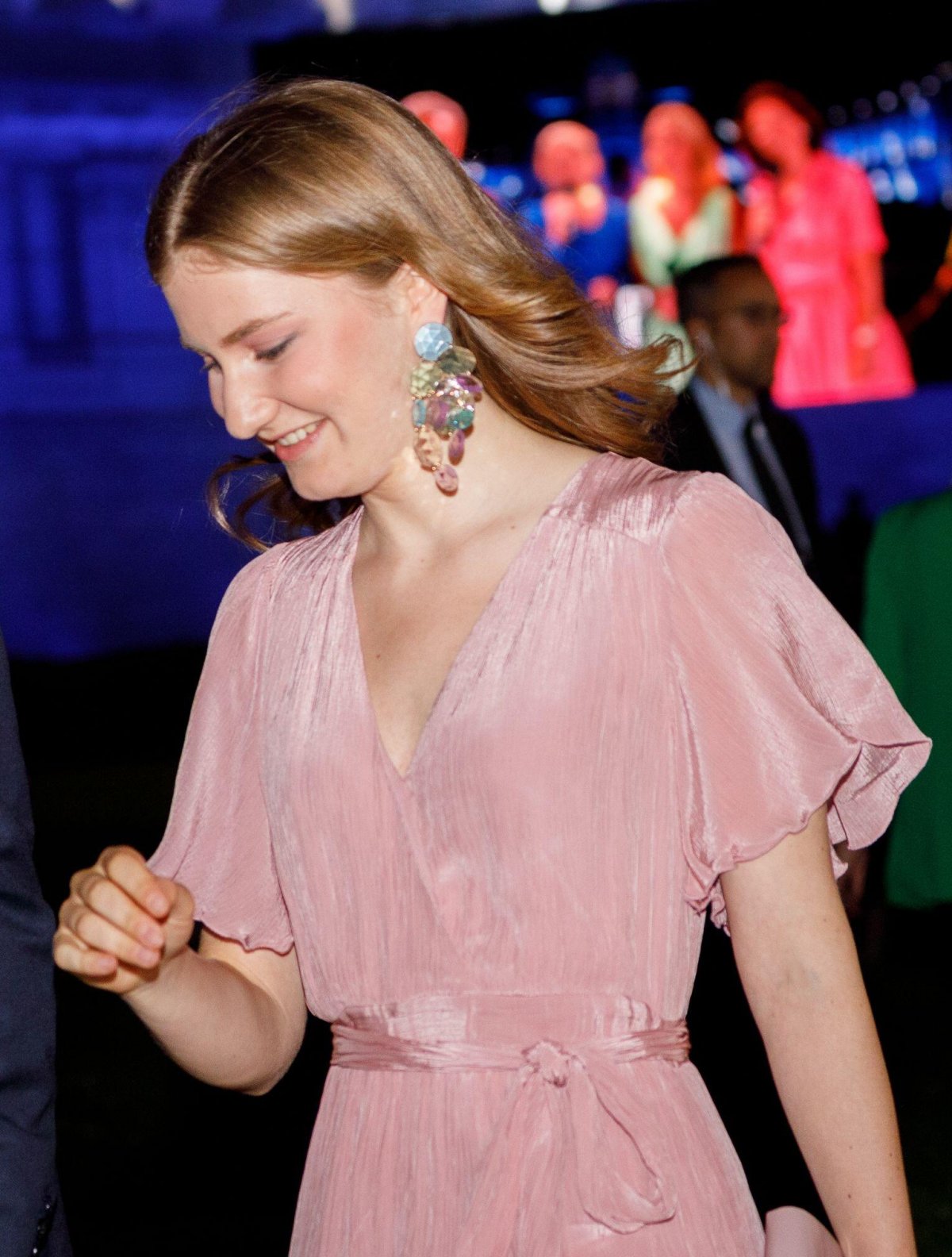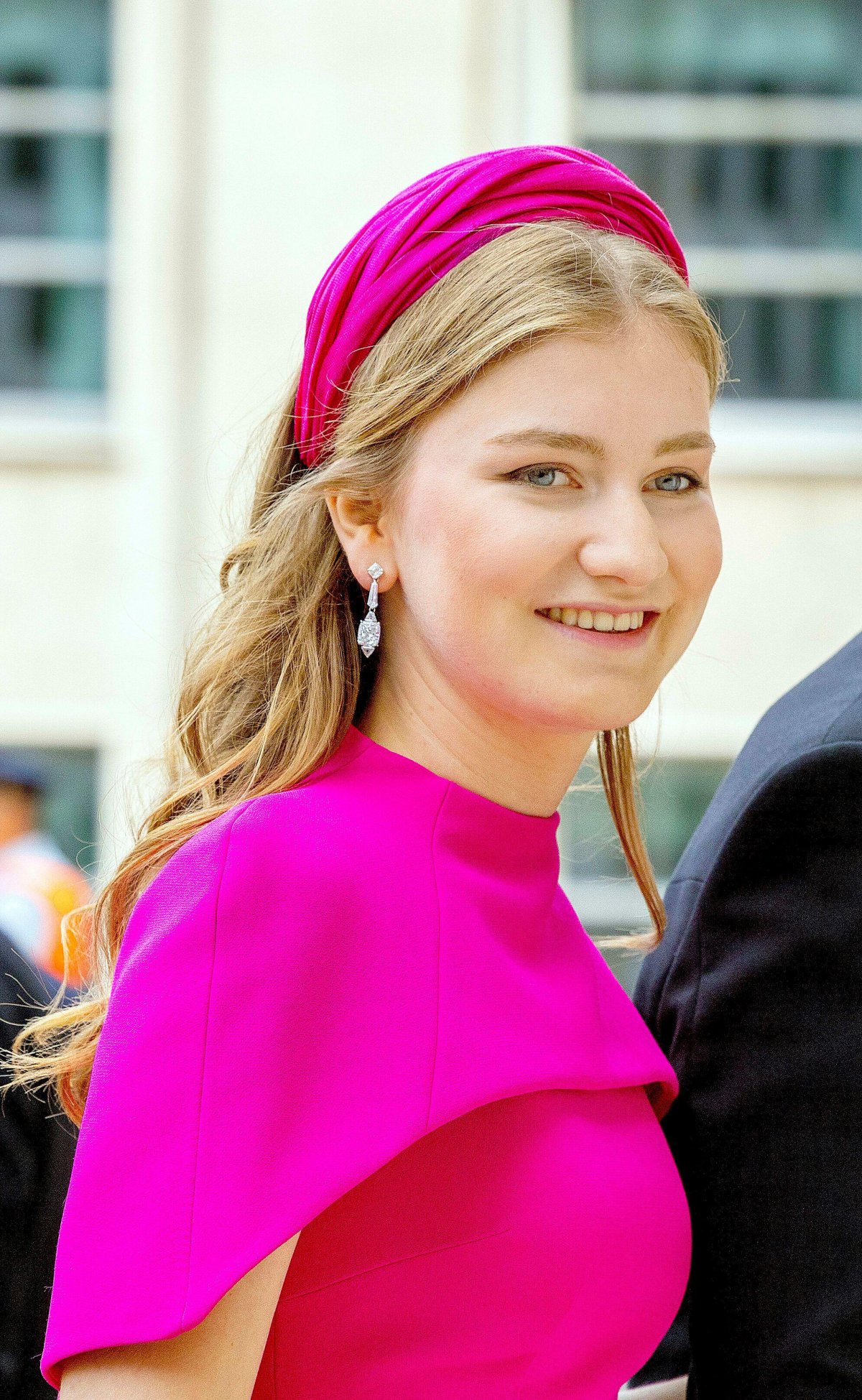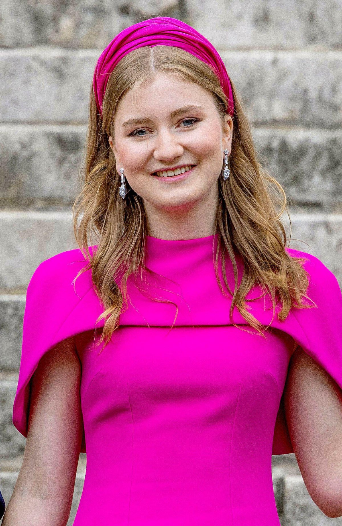 Princess Elisabeth, who has the title of Duchess of Brabant as heir to the throne, wore a bright pink dress from a brand that has also become a favorite with several royals, Safiyaa. (We recently saw the Princess of Wales wear a Safiyaa dress at Wimbledon, and pieces from the brand have also been worn by the Duchess of Sussex, the Princess of Orange, and more royal ladies from Denmark, Sweden, and Greece.) With the dress, Elisabeth wore a stunning pair of diamond earrings that she borrowed from her mother’s jewelry box for the occasion.