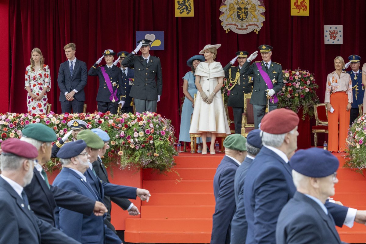 After the Te Deum service, the family attended the annual military and civilian parade in Brussels. Queen Mathilde and Princess Eleonore wore the same outfits that they had worn for the church service, but Princess Elisabeth changed into her naval uniform. Her aunt, Princess Astrid (not pictured here), also wore a uniform for the parade.