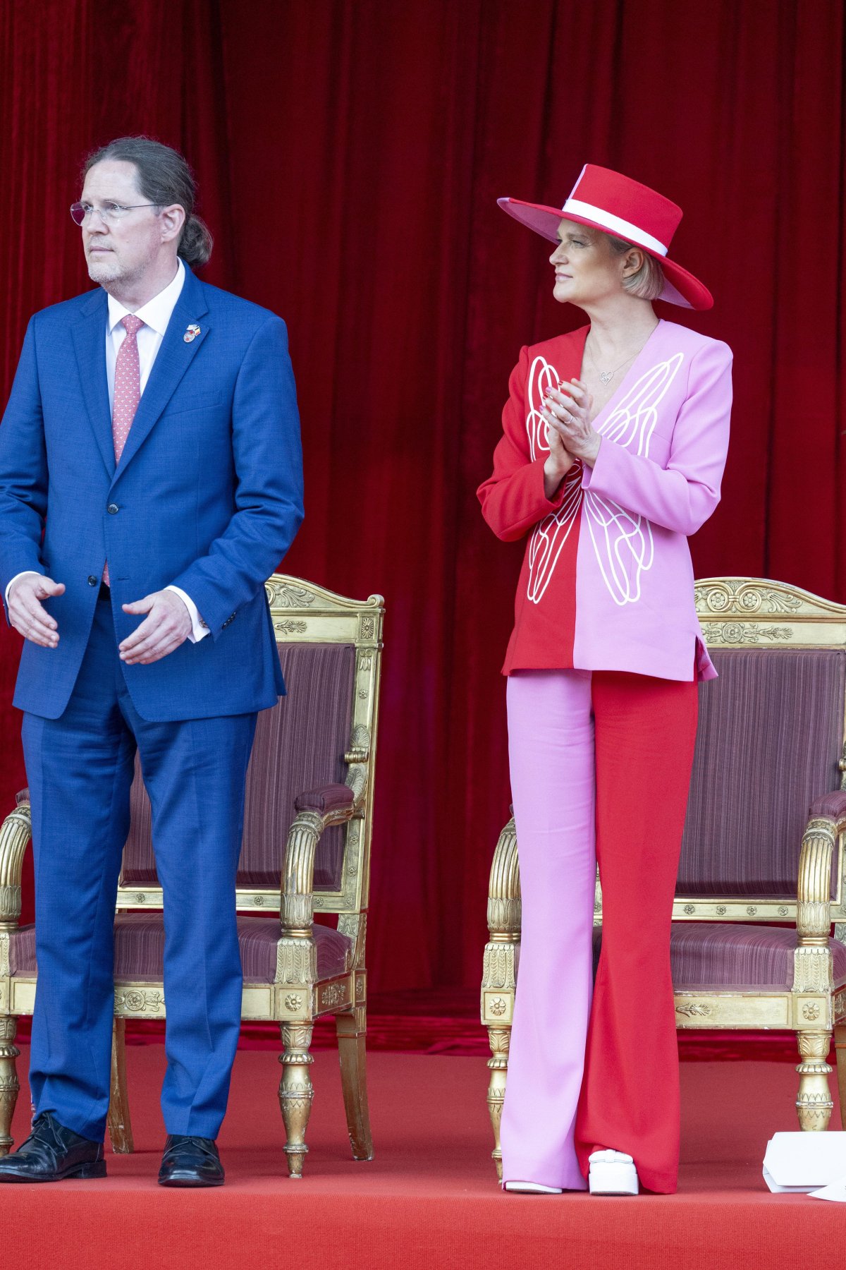Princess Claire was not present for this year’s National Day celebrations, but the royals were joined by two of the newest members of the family: Princess Delphine, the King’s half-sister, and her husband, Jim O’Hare. Delphine is an artist, and as usual, she wore an outfit with a great deal of flair for the parade.