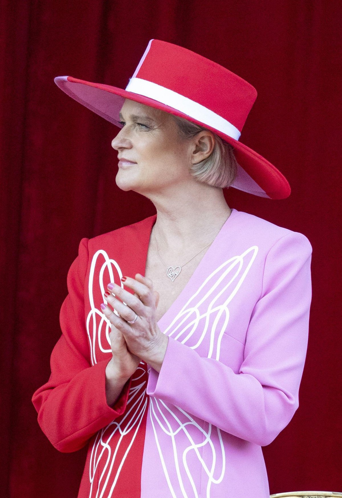 With her red, white, and pink ensemble, Princess Delphine wore a silver-toned necklace with a pendant spelling out the word “love.” It’s one of her own designs.
