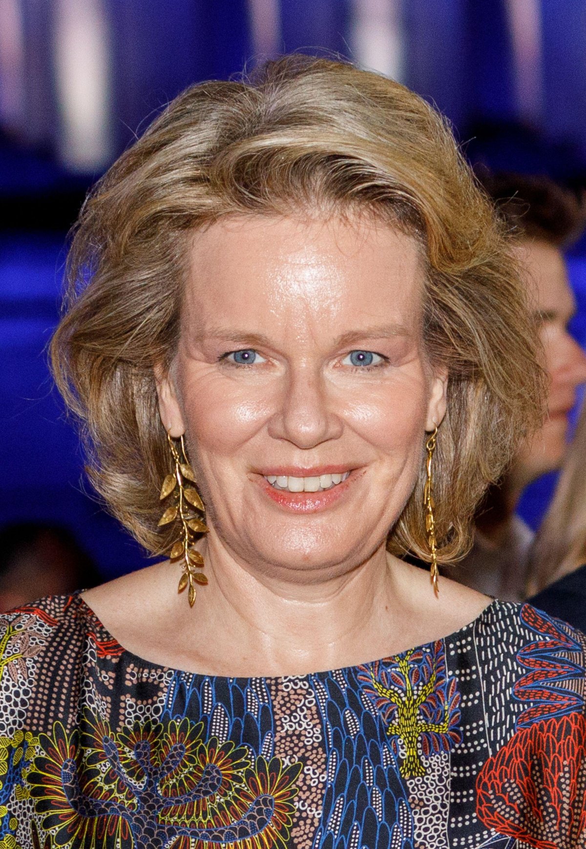 With her brightly-printed ensemble, Queen Mathilde opted for a pair of leafy gold statement earrings from her personal jewelry collection.