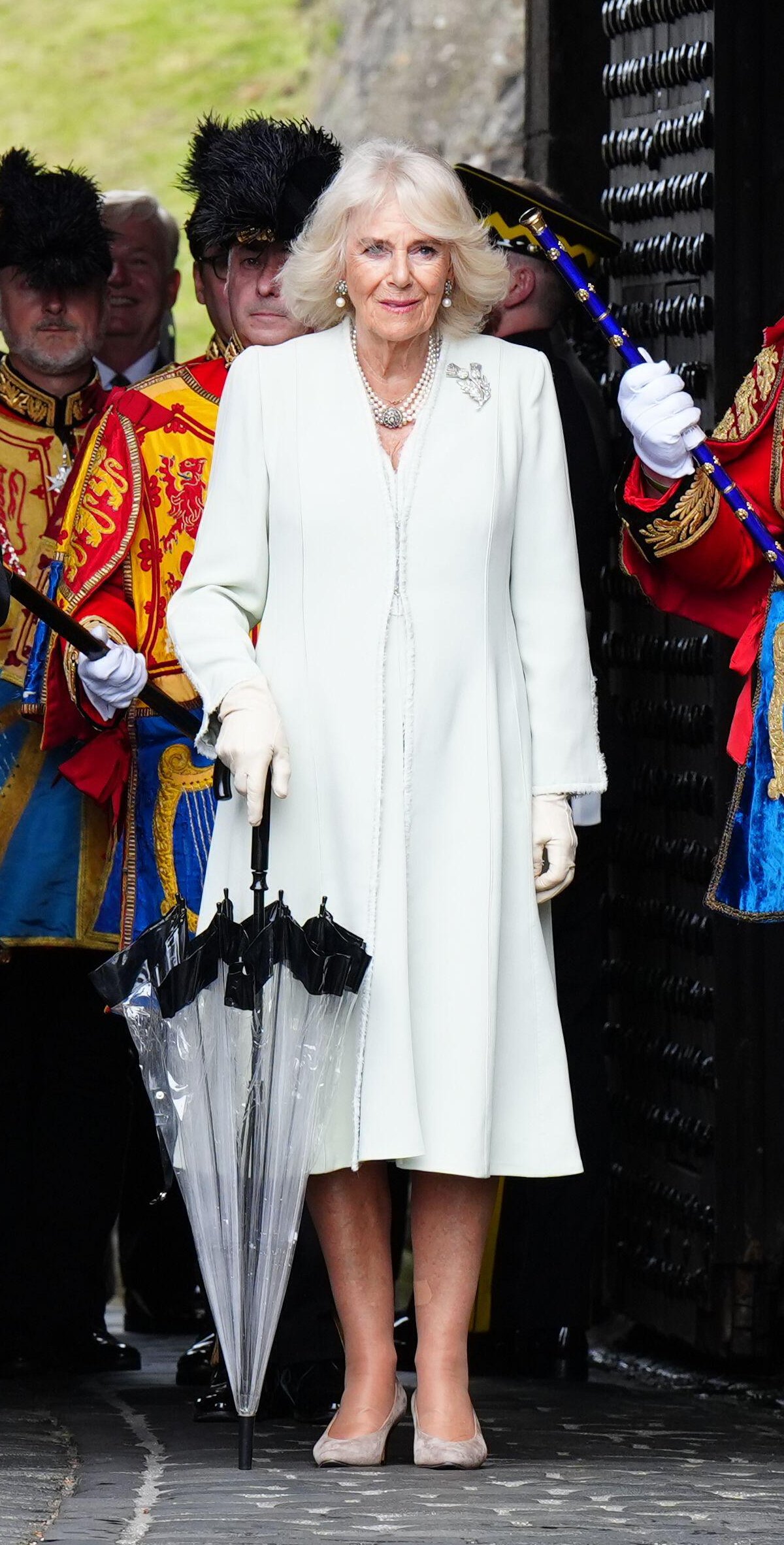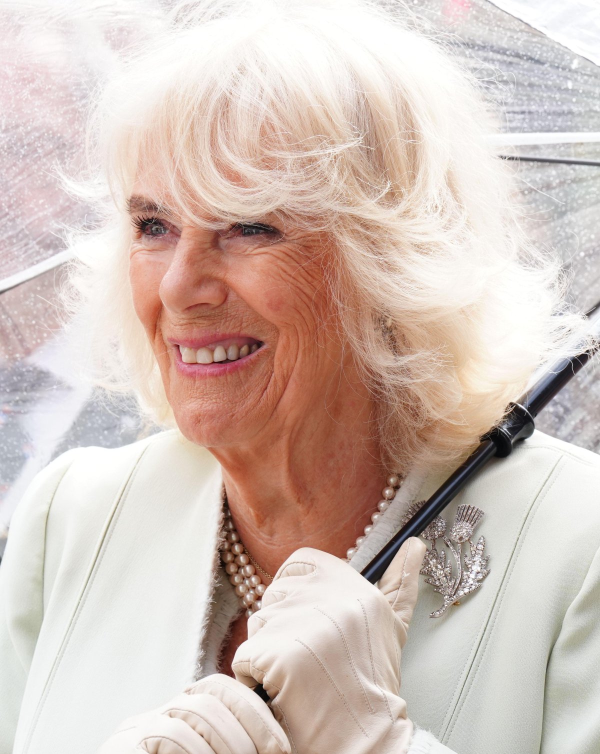 On her jacket, Camilla pinned a royal heirloom brooch that she’s been wearing for almost a decade, since the days when she was Duchess of Cornwall (or, more appropriately when in Scotland, Duchess of Rothesay). The Queen Mother’s Diamond Thistle Brooch features a pair of thistles and leaves set in diamonds.