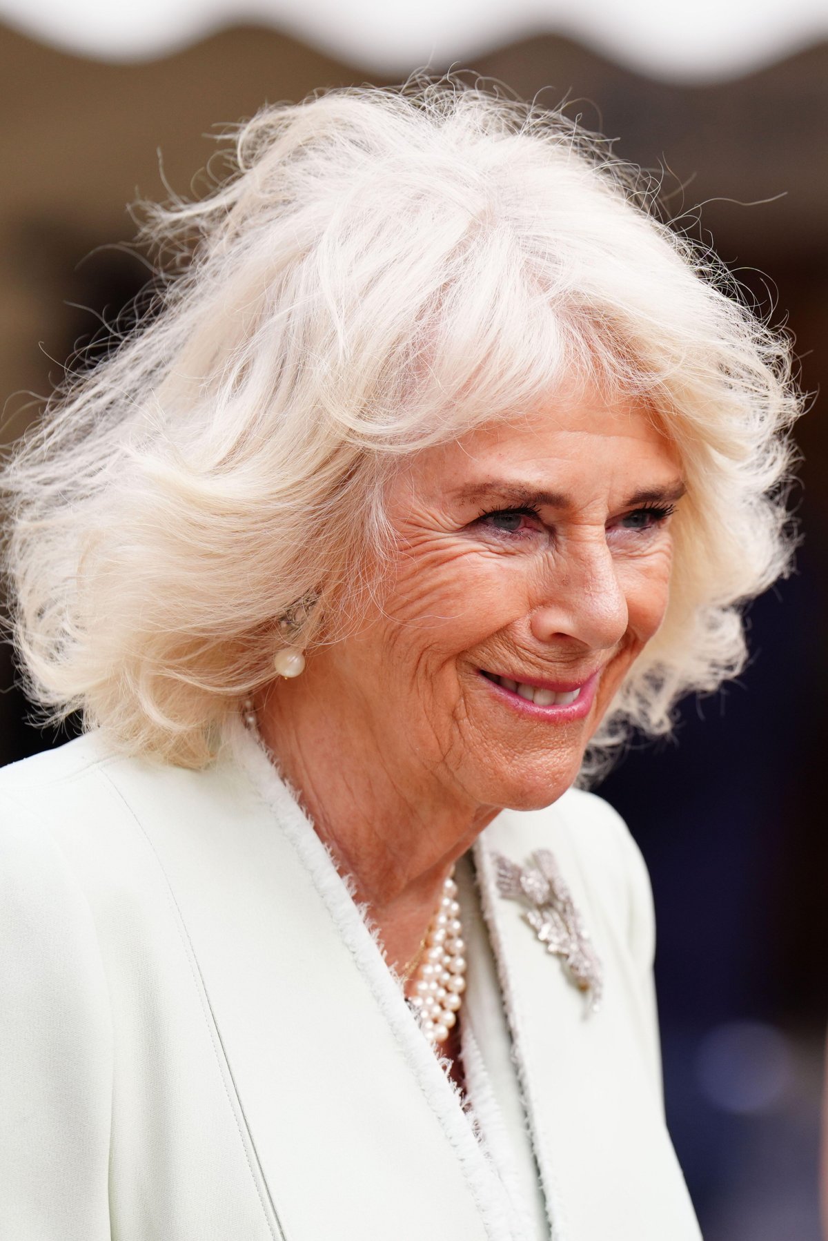 Camilla also added jeweled touches to the outfit, wearing pieces from her collection of diamonds and pearls. She paired her favorite diamond floral and pearl drop clip earrings with her four-stranded pearl choker, which has a distinctive round diamond clasp.