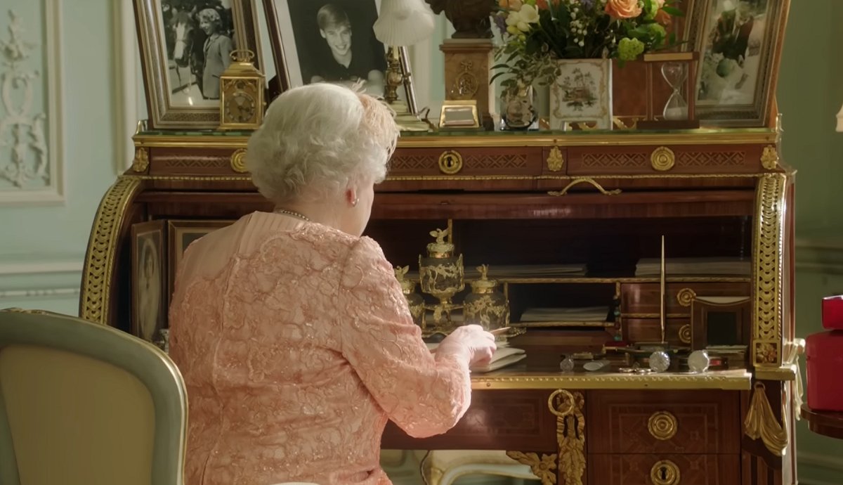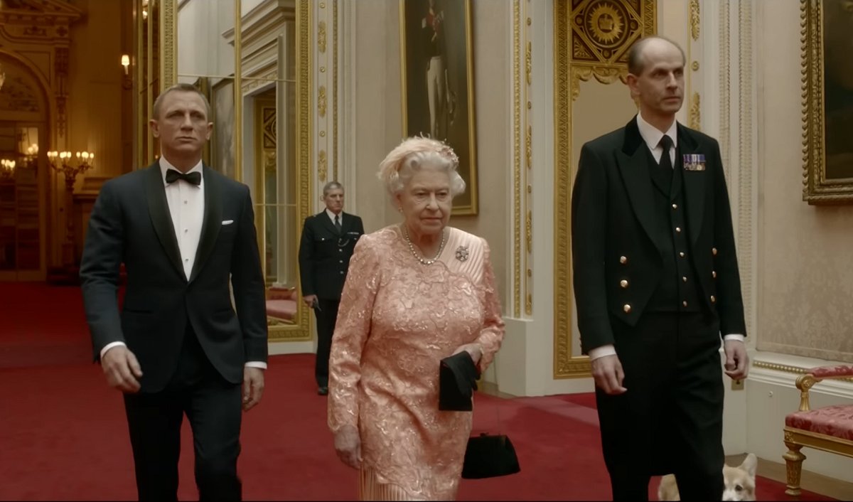 One cousin, Queen Margrethe II of Denmark–whose portrait is featured prominently on a table in the room–shared her recollections of the moment with the BBC for the documentary Elizabeth at 90 in 2016. She remembers realizing that James Bond really was in Buckingham Palace. When the camera focused on the lady at the desk, Queen Margrethe said, “I thought, ‘Is that somebody being very clever impersonating her?’ And she got up, and it was her!” According to Danny Boyle, the Queen’s line, “Good evening, Mr. Bond,” was an adlib–in the original script, she didn’t have any lines at all.