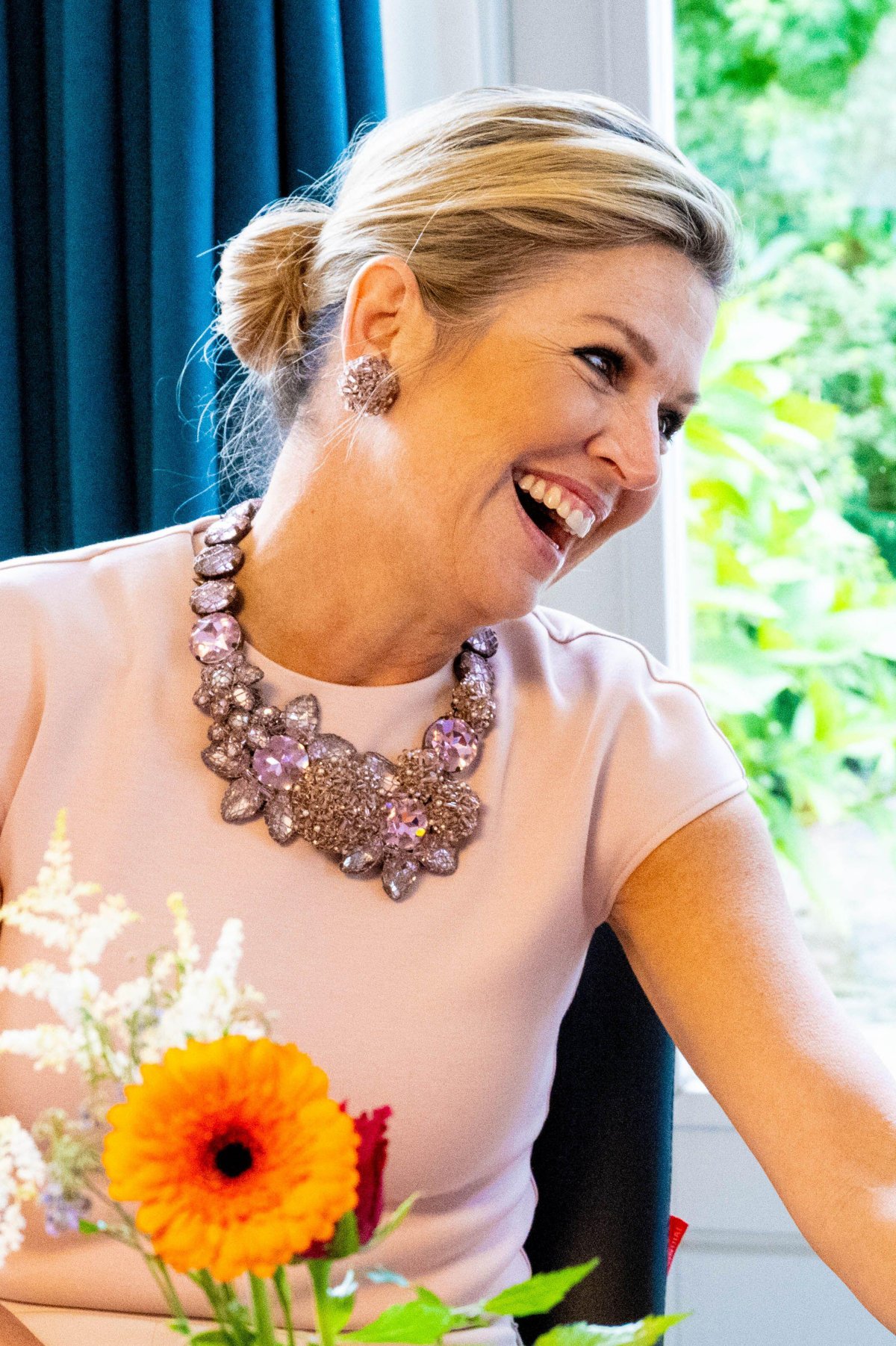 For the village visit, Maxima wore separates in tones of blush and ivory. Both the top and wide-leg trousers come from one of Maxima’s go-to brands, Natan.