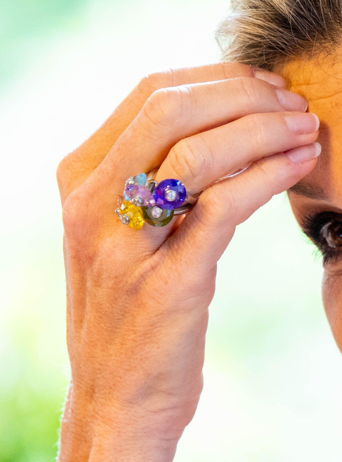 Here’s a closer look at the cocktail ring, which features various colorful gemstones with diamond centerpieces set on a double band. Some of the sections of the ring appear to have a floral design.