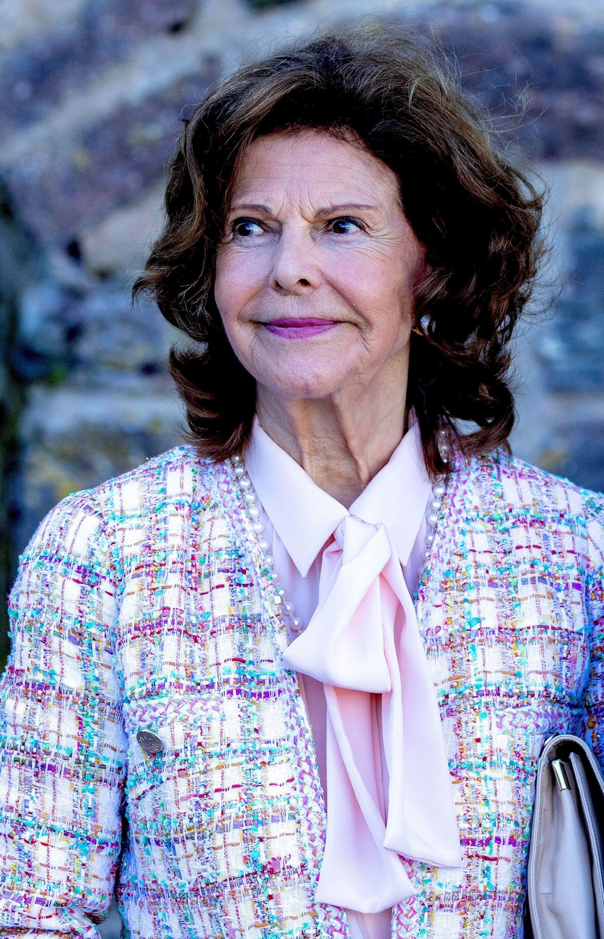 Queen Silvia opted for a structured tweed skirt suit for the celebrations at Solliden, softened a bit by a blouse with a bow detail. She added pearl earrings and a pearl necklace to the ensemble as well.