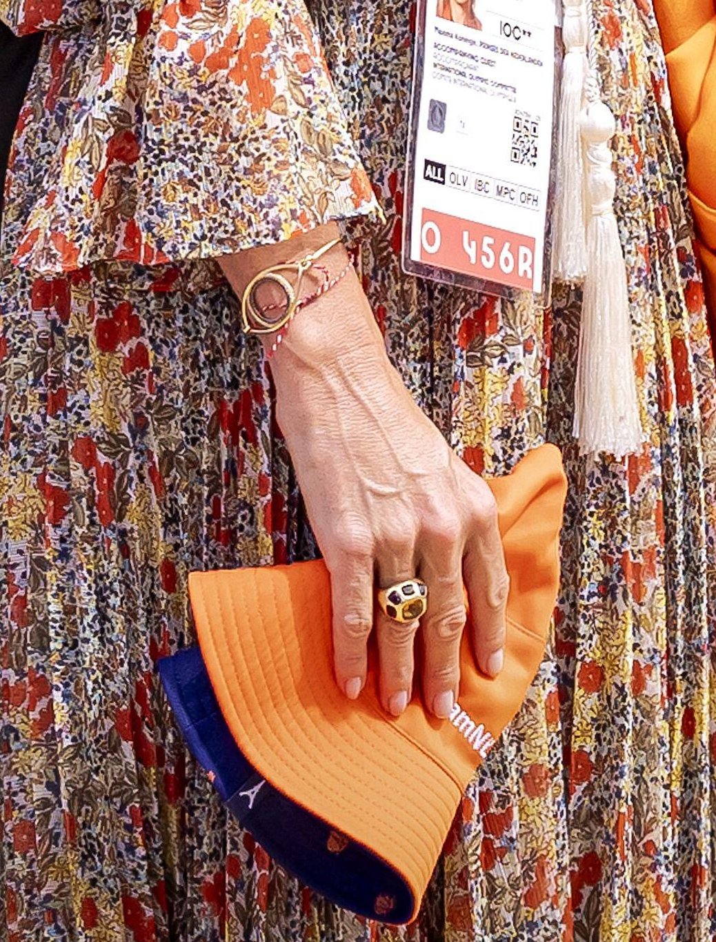 Queen Maxima added orange accessories, including a TeamNL bucket hat, to her floral ensemble for the mountain biking event. They were there to cheer on the Dutch cyclist Puck Pieterse, who finished fourth in the women’s competition.