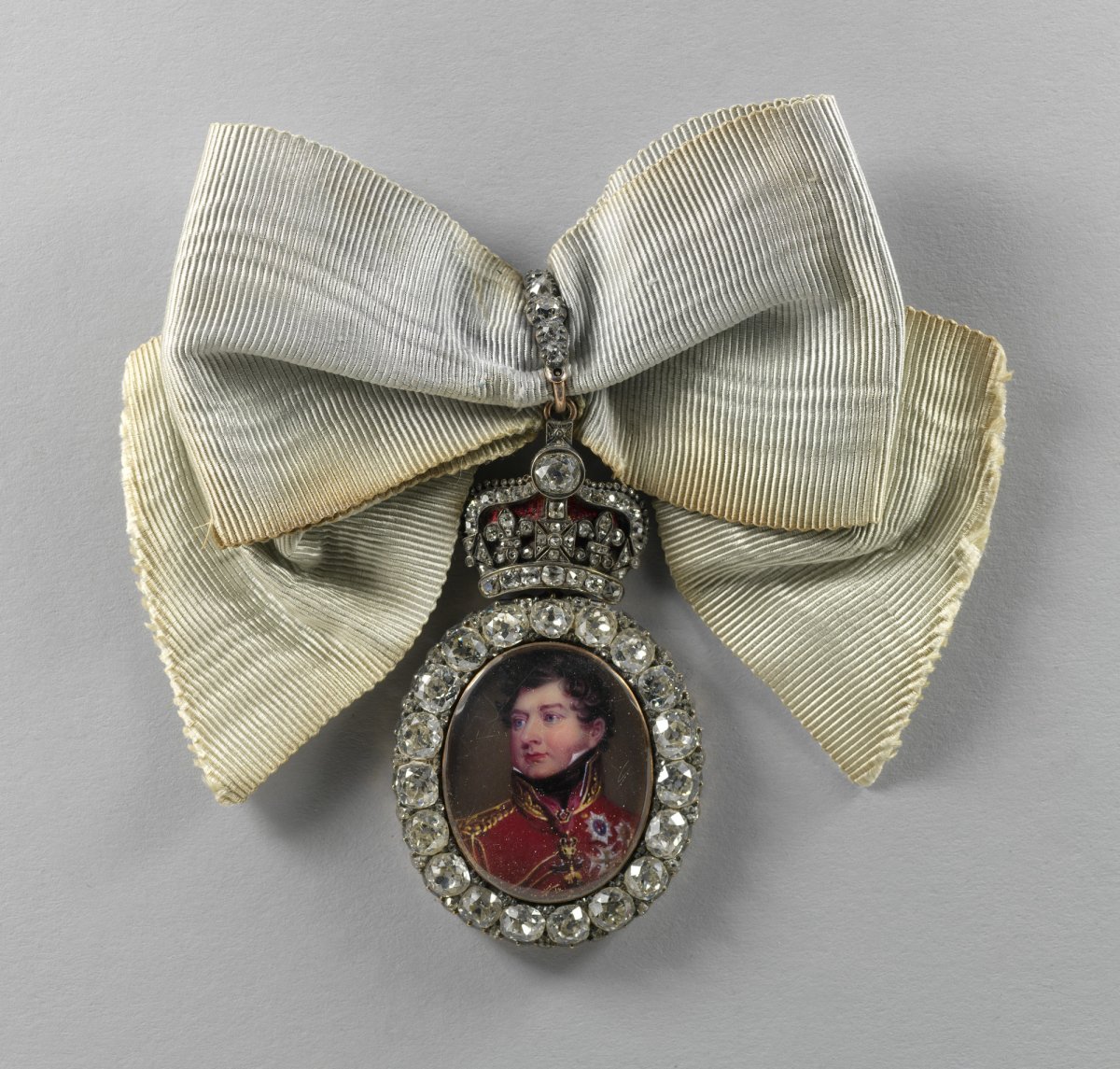 George IV was the first British monarch to distribute the kinds of royal family order badges that have become a standard part of gala dress for royal ladies over the past two centuries. The orders are worn pinned at the shoulder on formal occasions. The badges regularly feature a miniature portrait of the monarch, surrounded by diamonds, and suspended from ribbons. One of these was given to his niece, Princess Augusta of Cambridge.