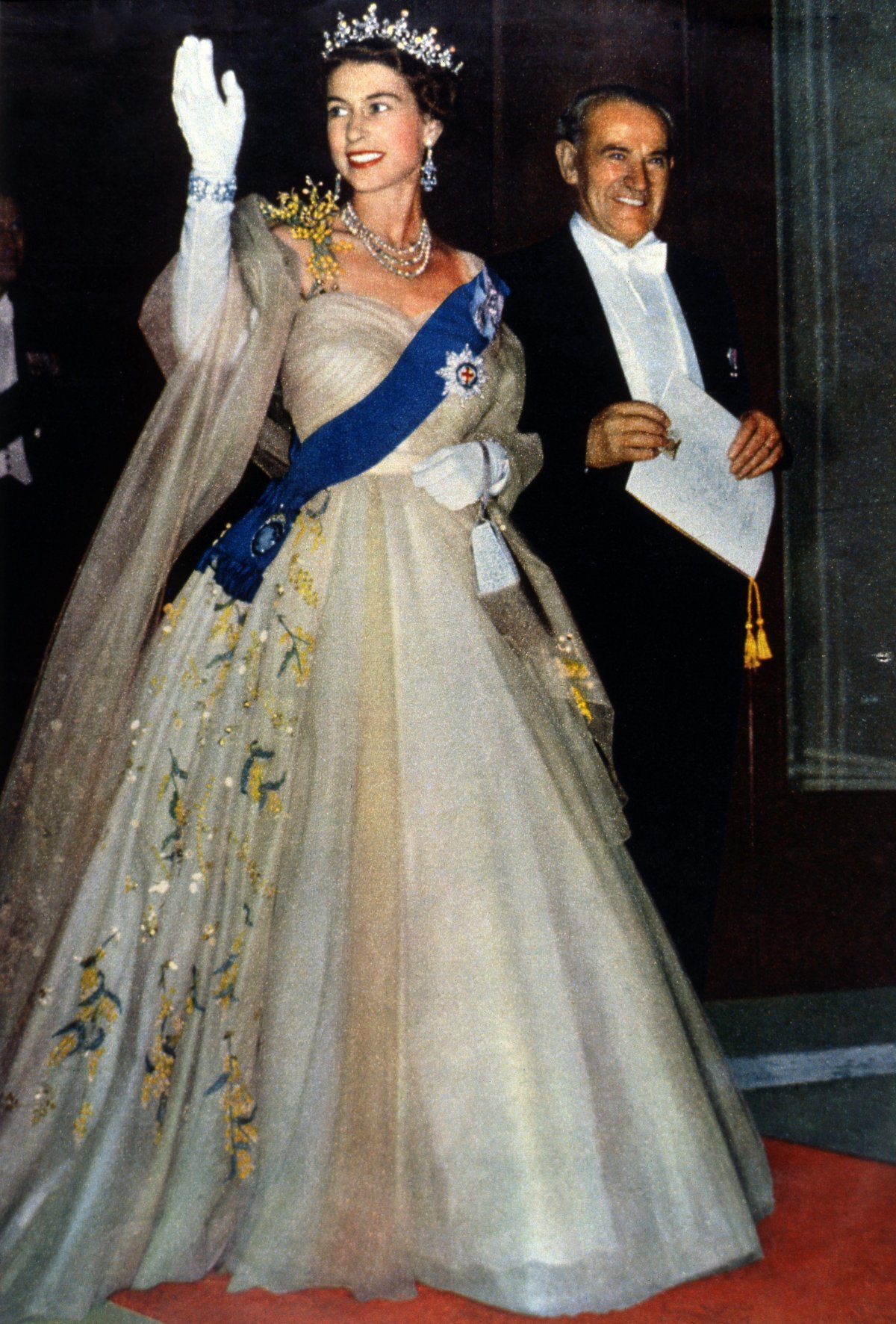 The Australian press was wowed by the gown. One newspaper, the Daily Mercury, wrote that the Queen was “a vision of superb loveliness” and provided an extensive, glowing description of her ensemble: “glorious” jewels placed on “the magnificent background” of “a lovely Hartnell gown of mimosa tulle with a fitted folded bodice and a full skirt with a short train. Sprays of wattle were embroidered on the skirt and another spray of wattle formed the right shoulder strap.” The special correspondent added, “It was at the Queen’s own request that Hartnell made her an evening dress using Australia’s national flower.”
