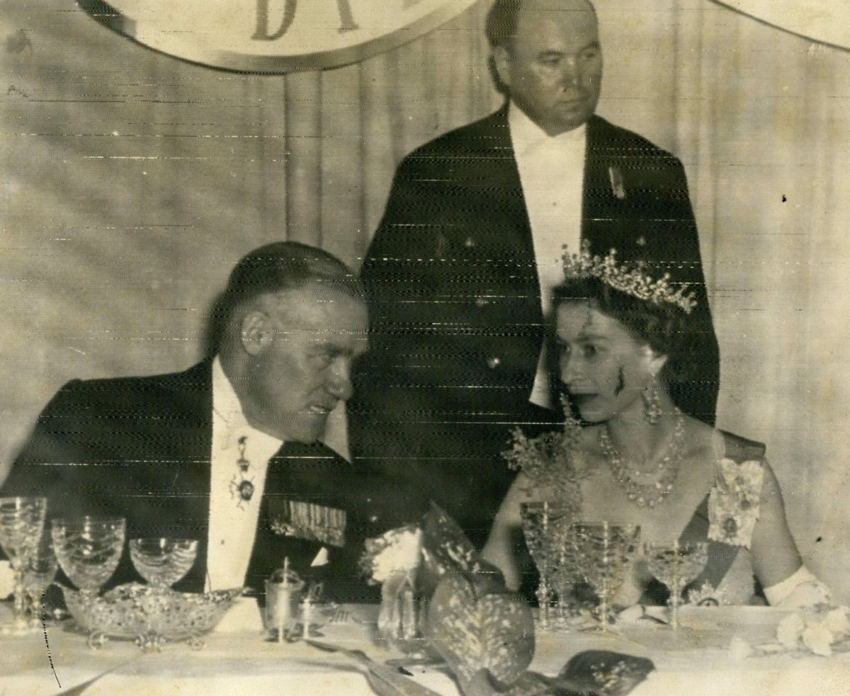 Queen Elizabeth II and Prince Philip were several months into their coronation tour of the Commonwealth when they arrived for a state banquet in Sydney, Australia, on February 4, 1954. The white-tie dinner, interestingly, was held at a luxury department store, David Jones, on Elizabeth Street in Sydney. The venue was the Great Restaurant, located on the seventh floor of the store. Here, Elizabeth and Philip are greeted by Joseph Cahill, the Premier of New South Wales, and his wife, Esmey Kelly Cahill. Delightfully, like the monarch, Esmey chose to wear a tiara for the banquet. Indeed, newspapers reported that a large number of the women in attendance wore tiaras for the occasion.