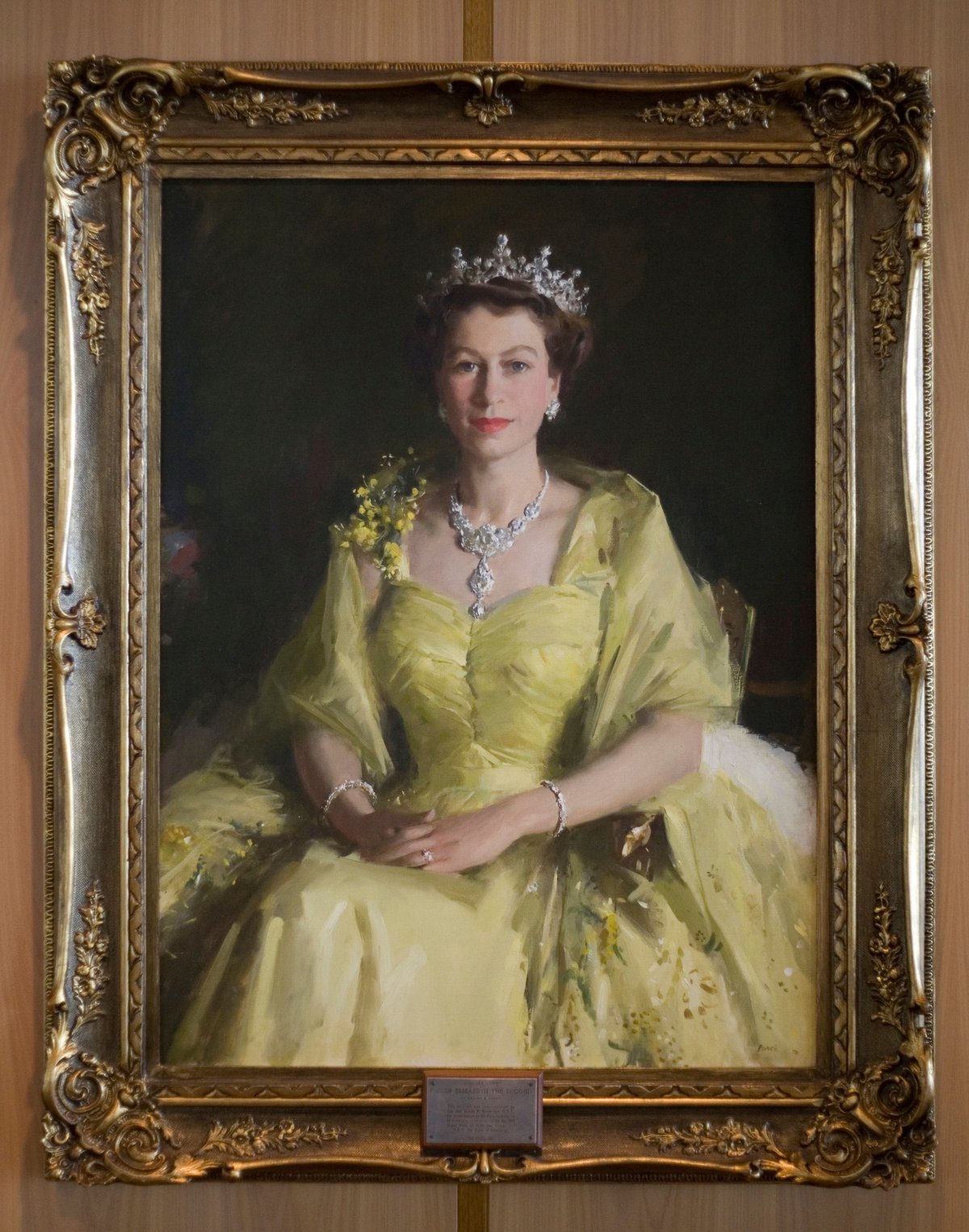 The Wattle Dress, as it became known, made such an impression that it was featured in an official portrait of Elizabeth II painted shortly after the banquet. After the Commonwealth Tour had ended, an Australian businessman commissioned the celebrated portrait artist William Dargie to paint the young monarch. With the help of Prime Minister Menzies, several sittings were arranged at Buckingham Palace in the autumn of 1954. The Age described the portrait, which was sent to be hung at Parliament House in Canberra, as “friendly and dignified.”