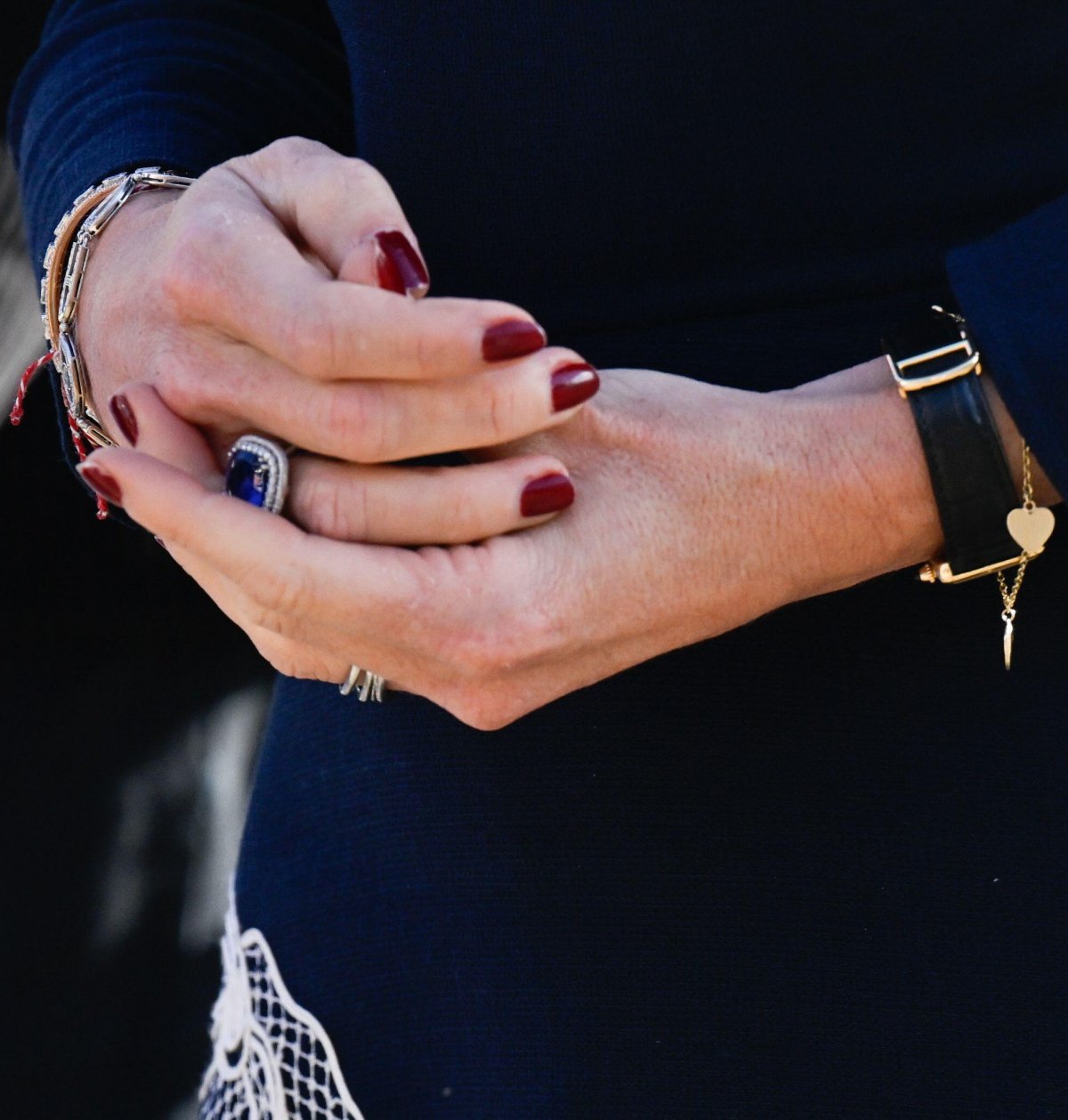 Máxima, as usual, also wore several bracelets and rings with her outfit. On her left wrist, she wore her watch and a gold charm bracelet, and on her left wrist, she added two diamond bracelets, including one featuring the initials of the King and their three daughters.