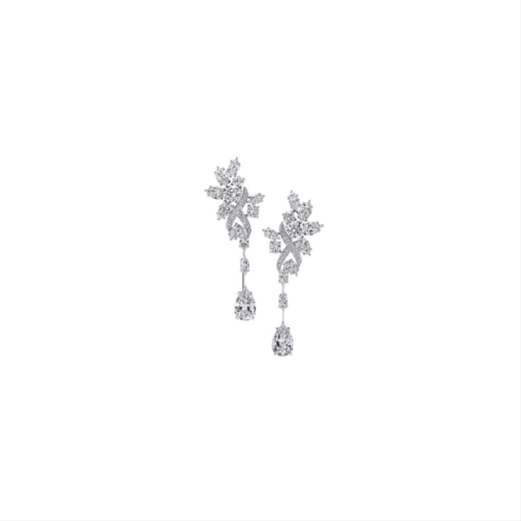 The earrings, which come from Harry Winston, feature elaborate diamond studs with floral and ribbon design motifs and pear-shaped diamond pendants.