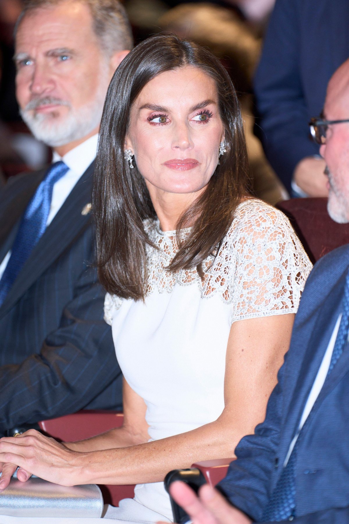 For the awards presentation, Queen Letizia wore an elegant white dress with embroidered silver lace accents on the bodice and the hem. UFO No More speculates that the dress may have been borrowed from her mother-in-law, Queen Sofia. Per Queen Letizia Style, Letizia paired the dress with silver shoes and a matching bag from Magrit.