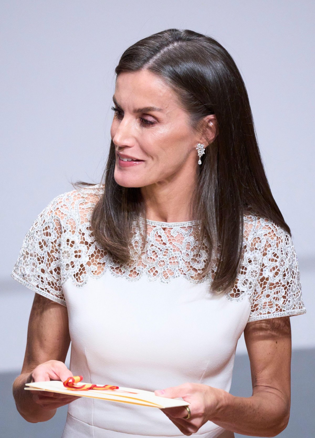 Letizia echoed the silver tones of the lace, bag, and shoes by wearing a sparkling pair of diamond earrings from her personal jewelry collection.