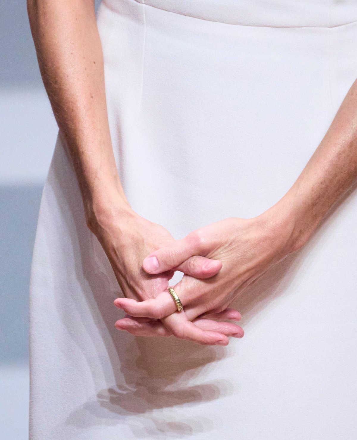 As usual, Letizia wore just one more piece of jewelry with her ensemble: a gold ring from the brand Coreterno. She’s been wearing the ring on her left hand for over a year, after debuting it during on Epiphany Day in 2023. The ring, thought to be a gift from King Felipe, features text inside and out. The phrase Amor che tutto move, which can be found on the outside of the ring, comes from Dante’s Divine Comedy. (It translates to “Love moves everything.”) The engraving on the inside of the ring reads, “As long as I’m existing you will be loved.”