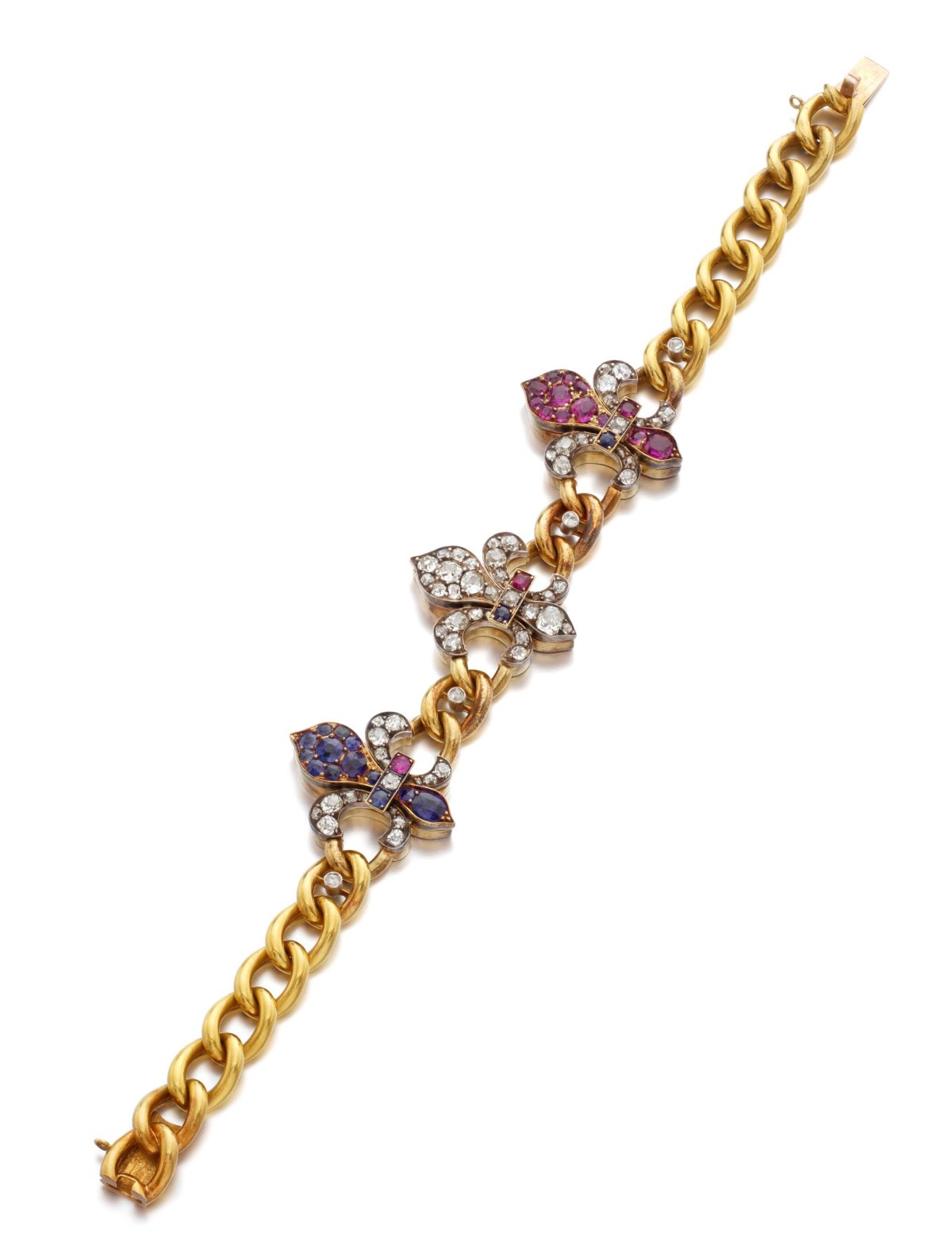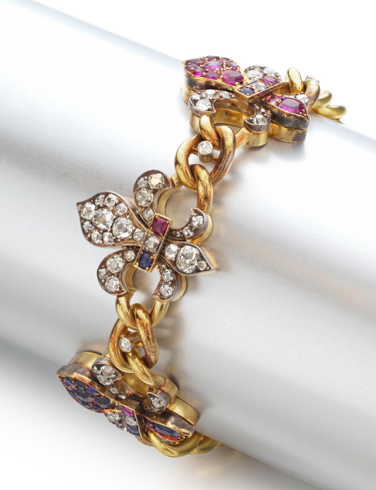 The bracelet, with its distinctive yellow gold chain construction, was reportedly made around 1880. The lot notes provided by Sotheby’s describe the jewel as “centering three fleur-de-lys motifs set with cushion-shaped, oval and circular-cut rubies and sapphires, accented by old cushion-shaped diamonds, on a polished gold curb-link chain.”