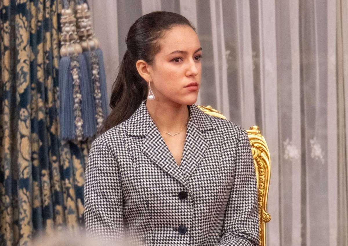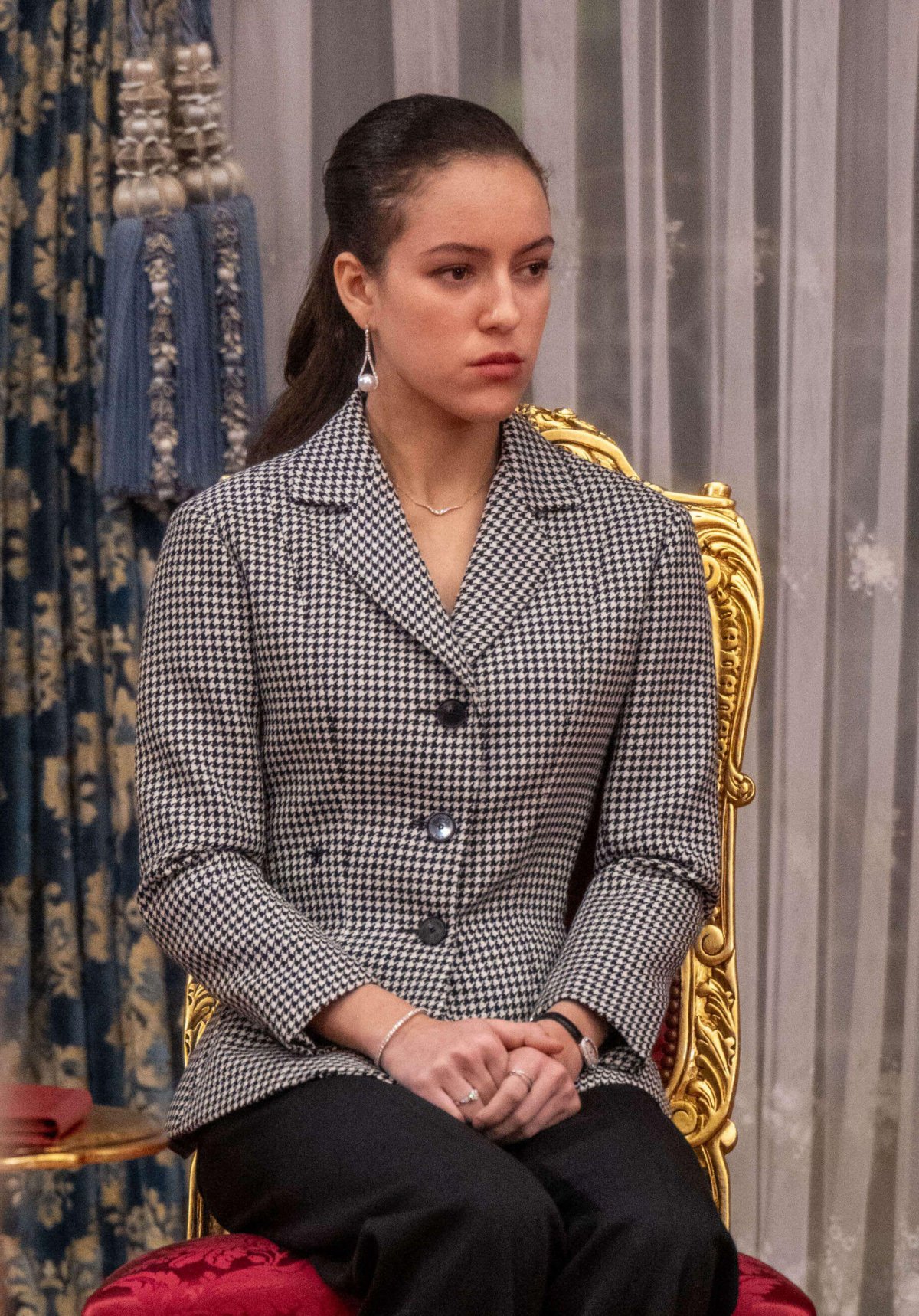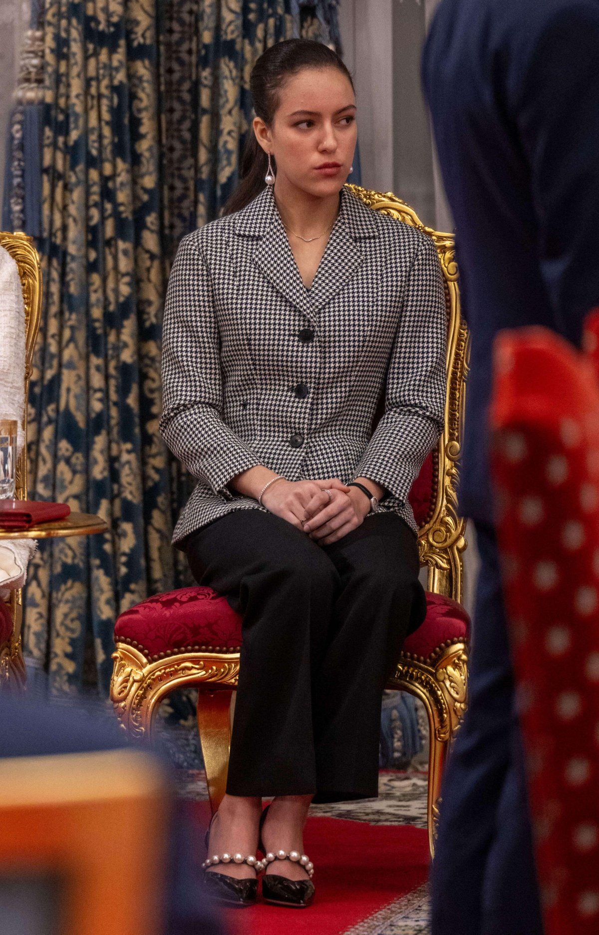 The ceremony marked Lalla Khadija’s first public engagement in several years. The seventeen-year-old princess is reportedly an accomplished student at the Royal College of Rabat, speaking Arabic, French, English and Spanish fluently. She was carefully poised during the public ceremony, following the example of her aunts. She dressed conservatively for the occasion in a black-and-white houndstooth jacket and black trousers, with a little playful, youthful interest peeking through thanks to the pearl embellishments on her shoes.