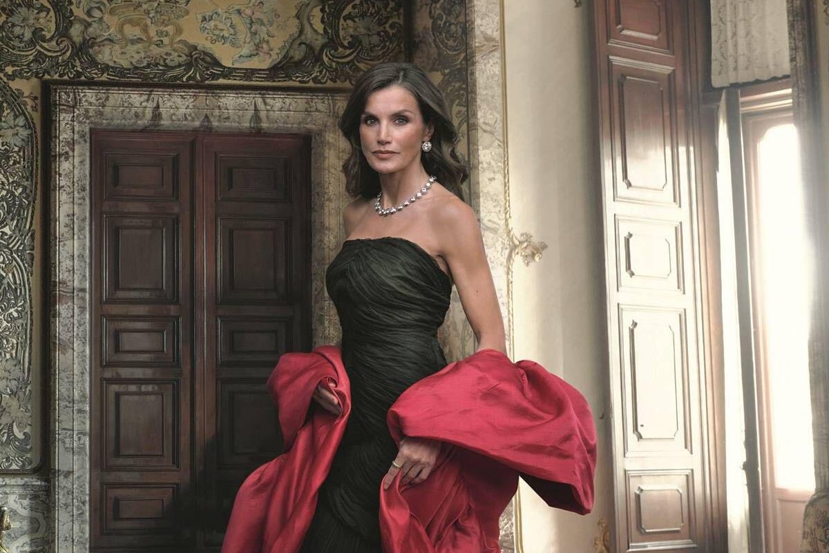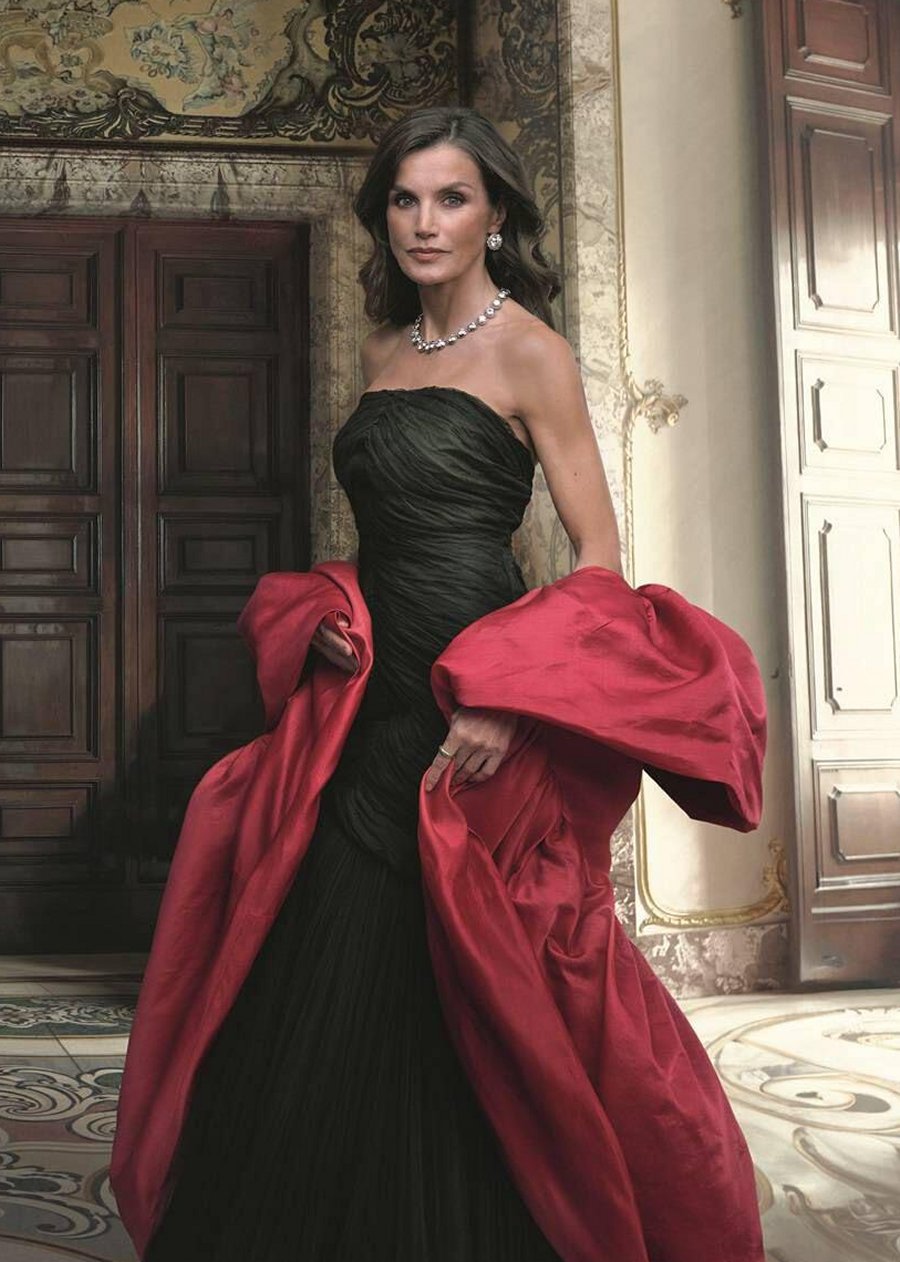 Leibovitz is known for the way she uses light in her imagery, something particularly evident in the portrait of Queen Letizia. In the image, the Queen wears a vintage black Balenciaga evening gown and scarlet-colored wrap, highlighted by the light that streams in from the window behind her.