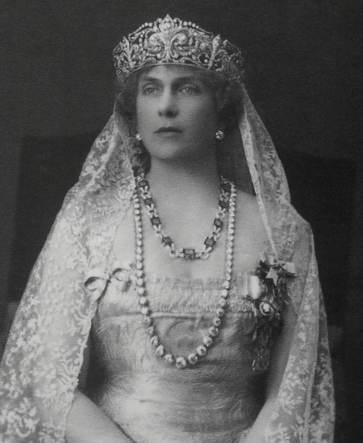 Indeed, these diamonds have been worn for Spanish royal portraits for more than a century. This image of Queen Ena was taken by the noted Danish court photographer Christian Franzen in Madrid in 1922. She’s wearing the same diamond earrings and necklace that Letizia wears in the new Leibovitz portrait in this image. (The necklace can be worn in longer and shorter settings.) She also wears the grand fleur-de-lis tiara that is also part of the joyas de pasar collection, as well as an emerald necklace that was later sold. A century later, the diamonds are still glittering on the Queen of Spain, just as Ena had hoped.