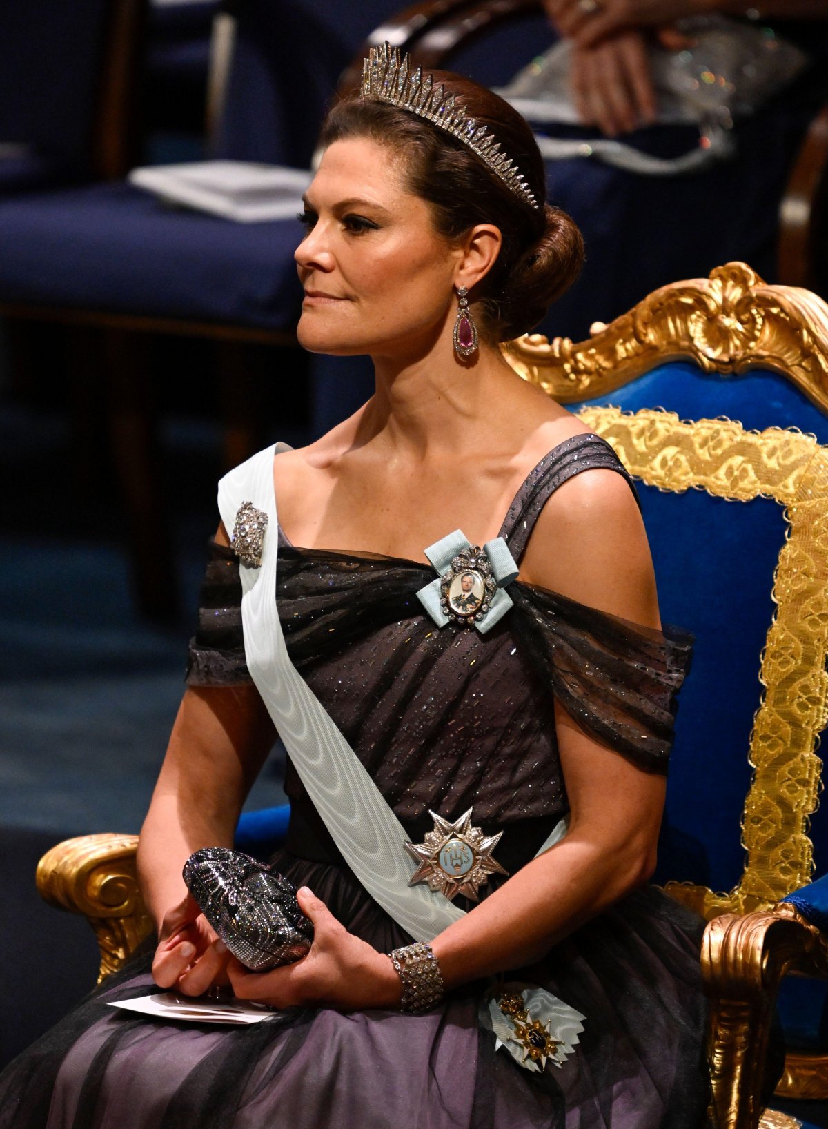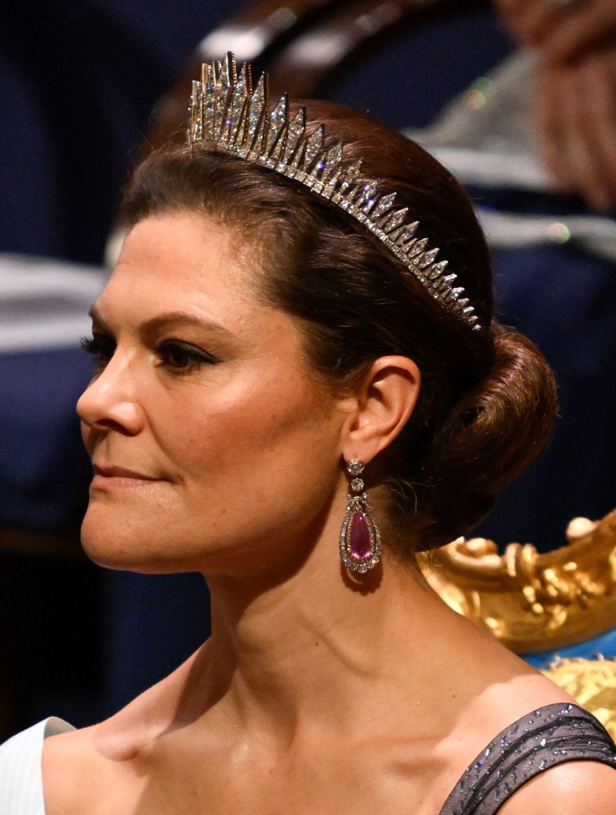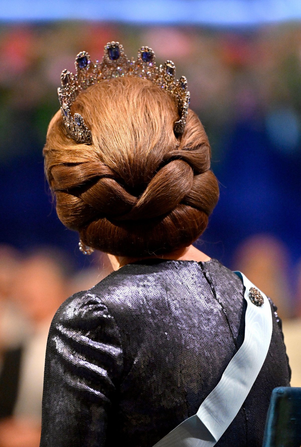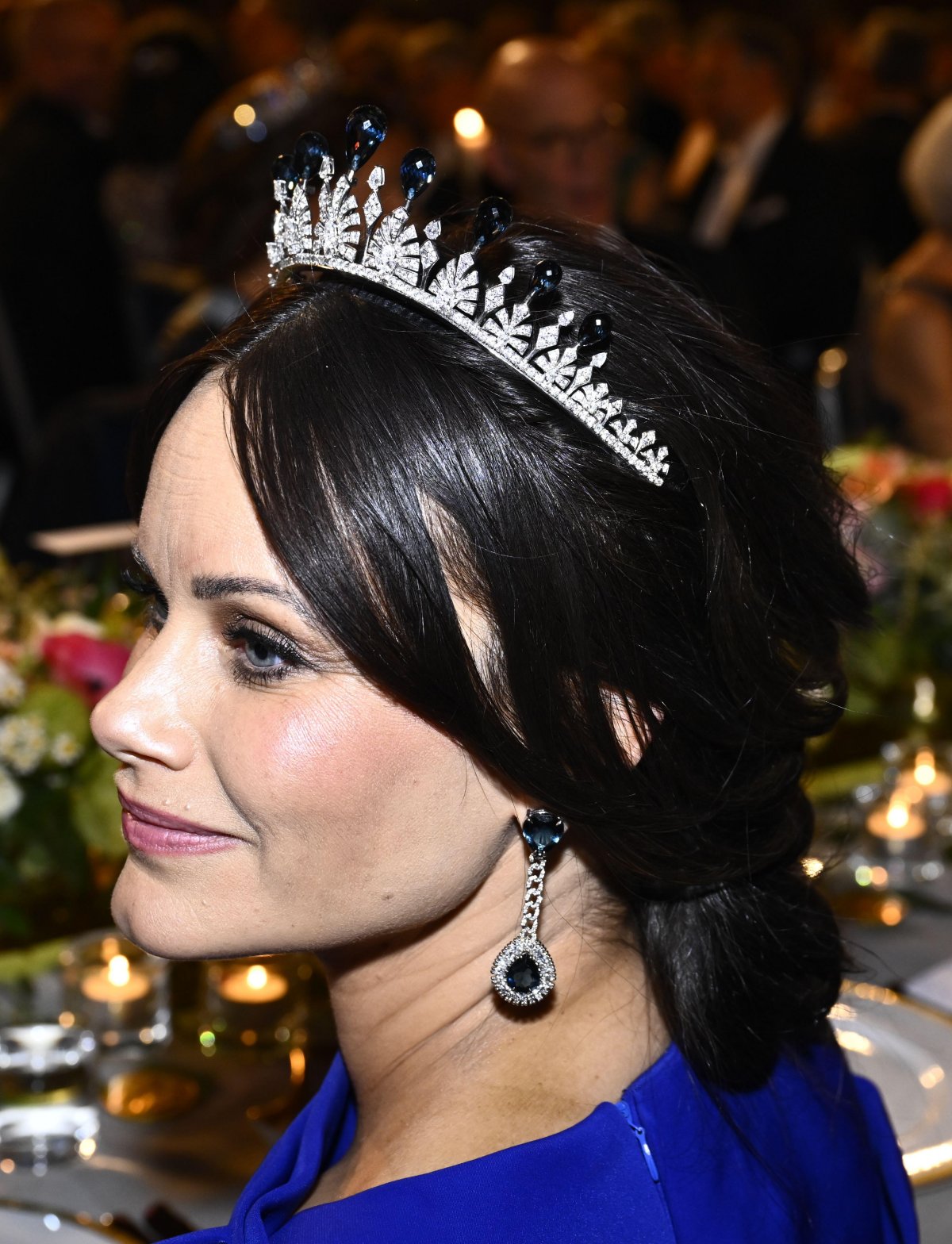 As she usually does for the Nobels, Sofia wore her own diamond palmette tiara for the ceremony and banquet. The tiara, which she debuted on her wedding day in 2015, can be worn with a series of different gemstone toppers. This London blue topaz set was first spotted on the princess at the Finnish state banquet in Stockholm last April.