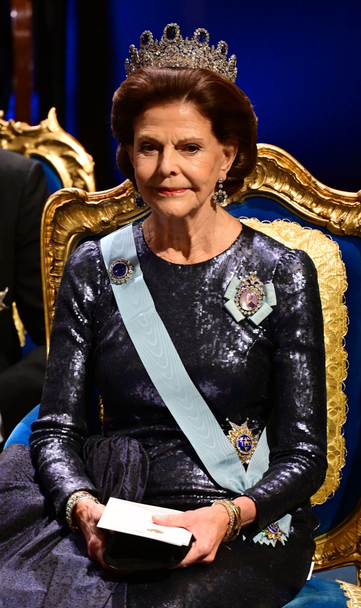 Queen Silvia reached into her wardrobe archives for this year’s Nobel gown, re-wearing a navy blue sequin ballgown from the designer Maknam. Her decorations include the sash and star of the Order of the Seraphim and King Carl XVI Gustaf’s Royal Family Order.