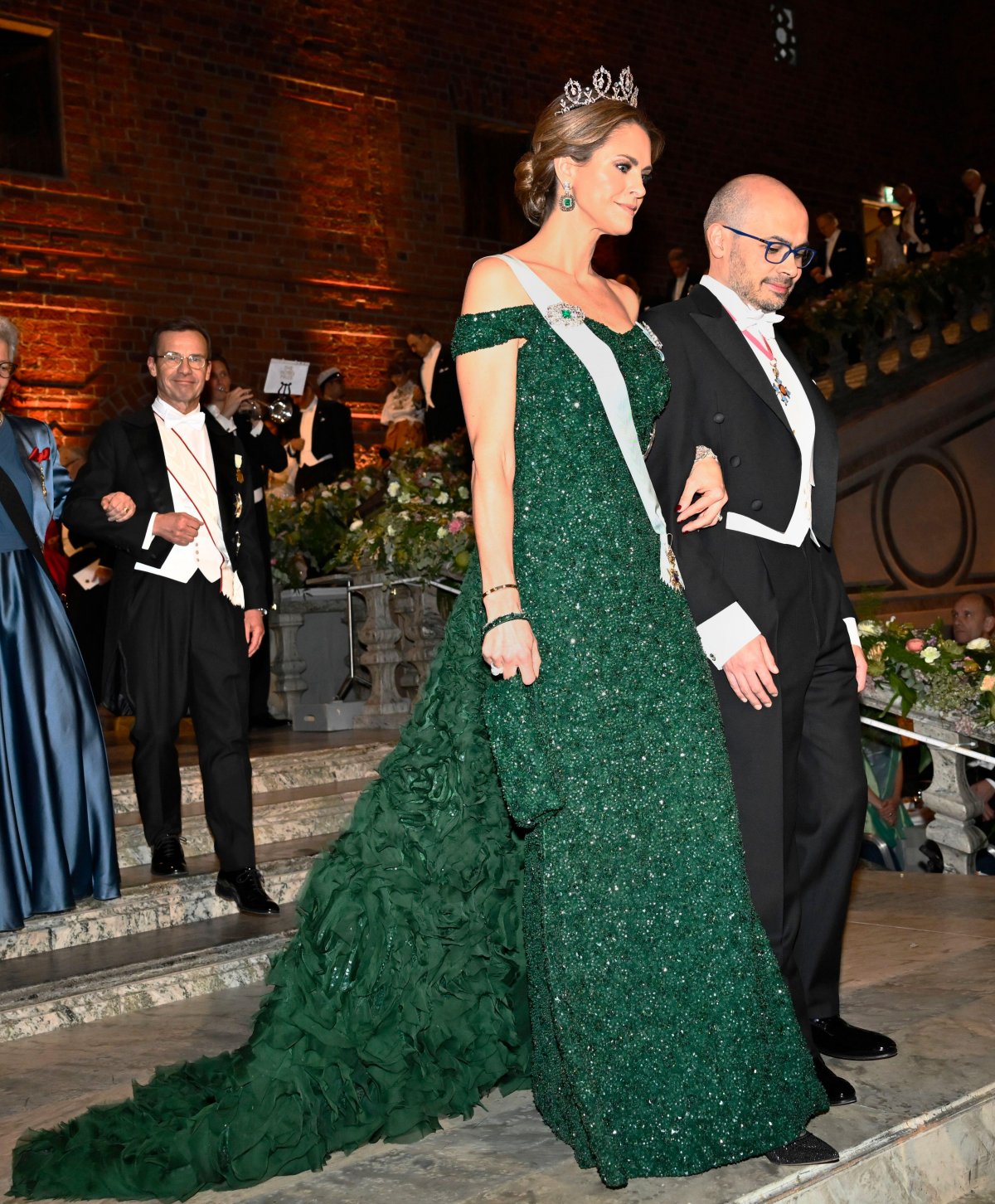 It was a real joy to see Princess Madeleine make her triumphant return to the Nobels, appearing at the ceremony and banquet for the first time since December 2019. She made a splash at this year’s festivities in a dark green evening gown, complete with a dramatic ruffled train, from the designer Fadi El Khoury. She also wore the Order of the Seraphim sash and star and her father’s Royal Family Order on the dress.