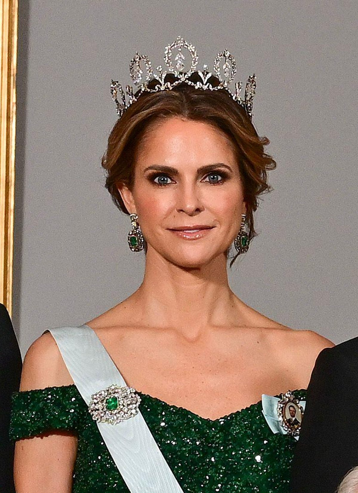 Madeleine added even more sparkle to the gown by wearing the Connaught Diamond Tiara, an heirloom family jewel from the Edwardian period. We most recently saw her wear the tiara, with another gown from the same designer, at the Nobels in 2016. The convertible tiara can also be worn in two necklace settings, and Madeleine has been spotted in both of them over the years.