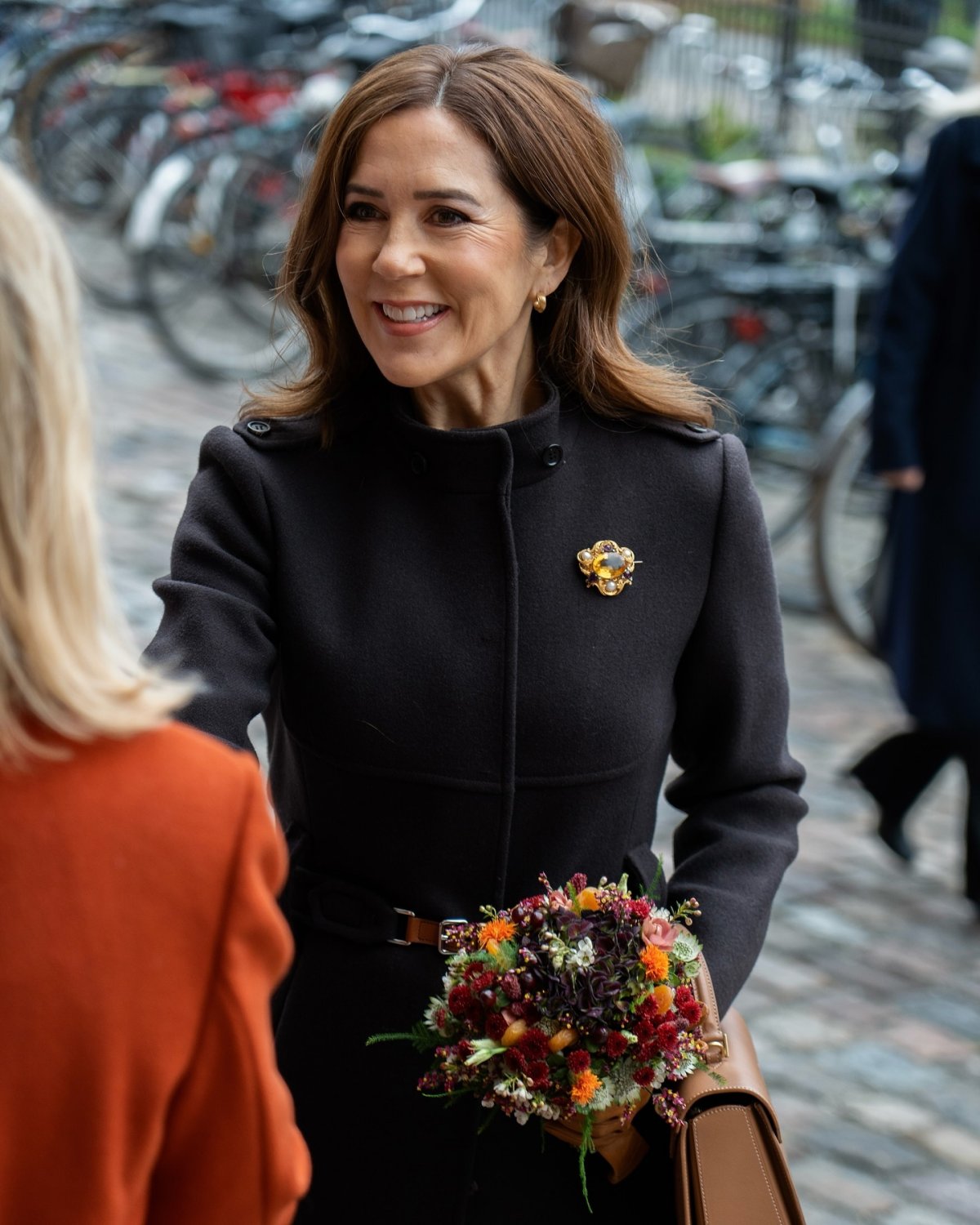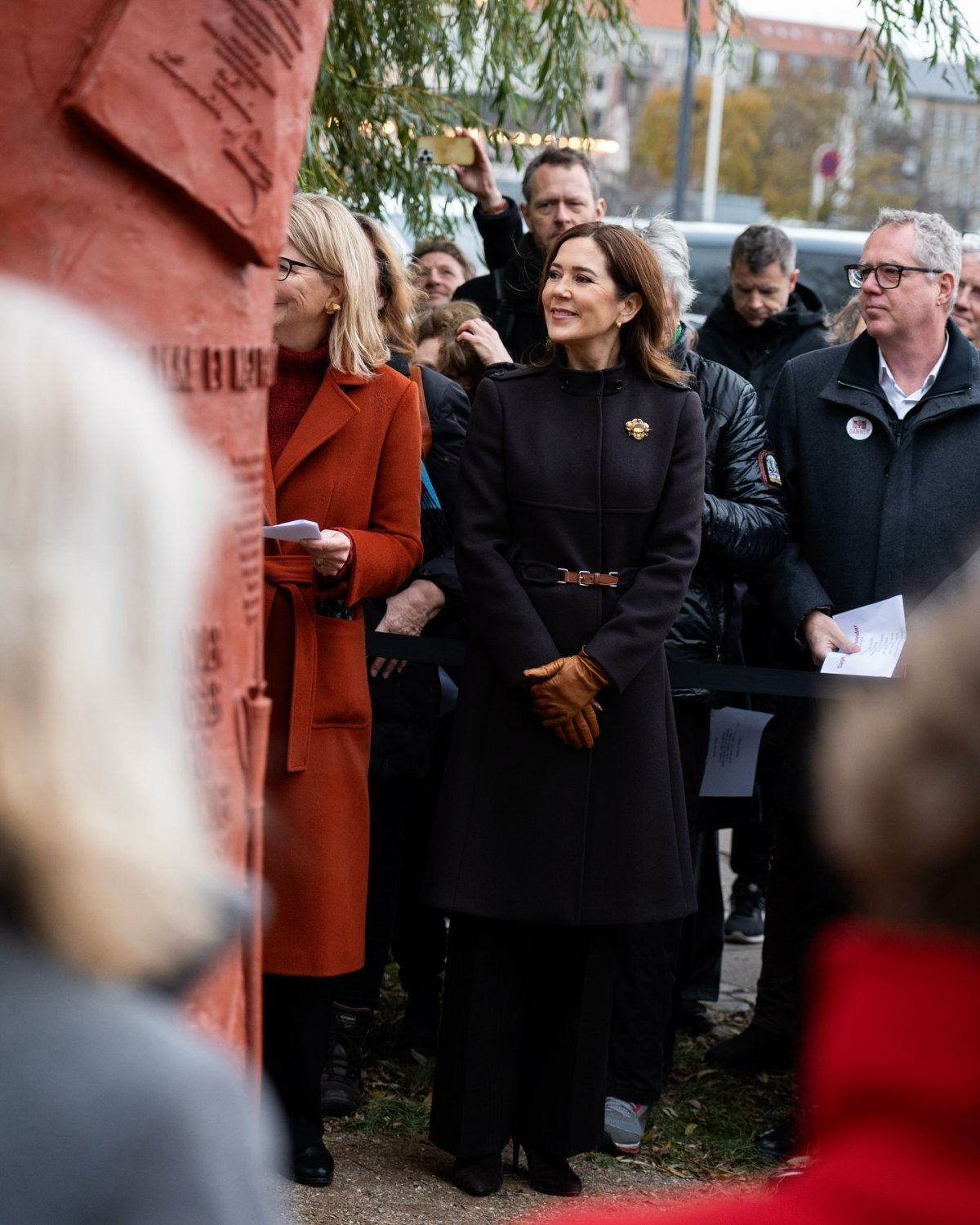 For the statue unveiling, Queen Mary wore a dark wool coat (from Prada, per UFO No More) and trousers with gold accessory pieces, including earrings from Dulong.