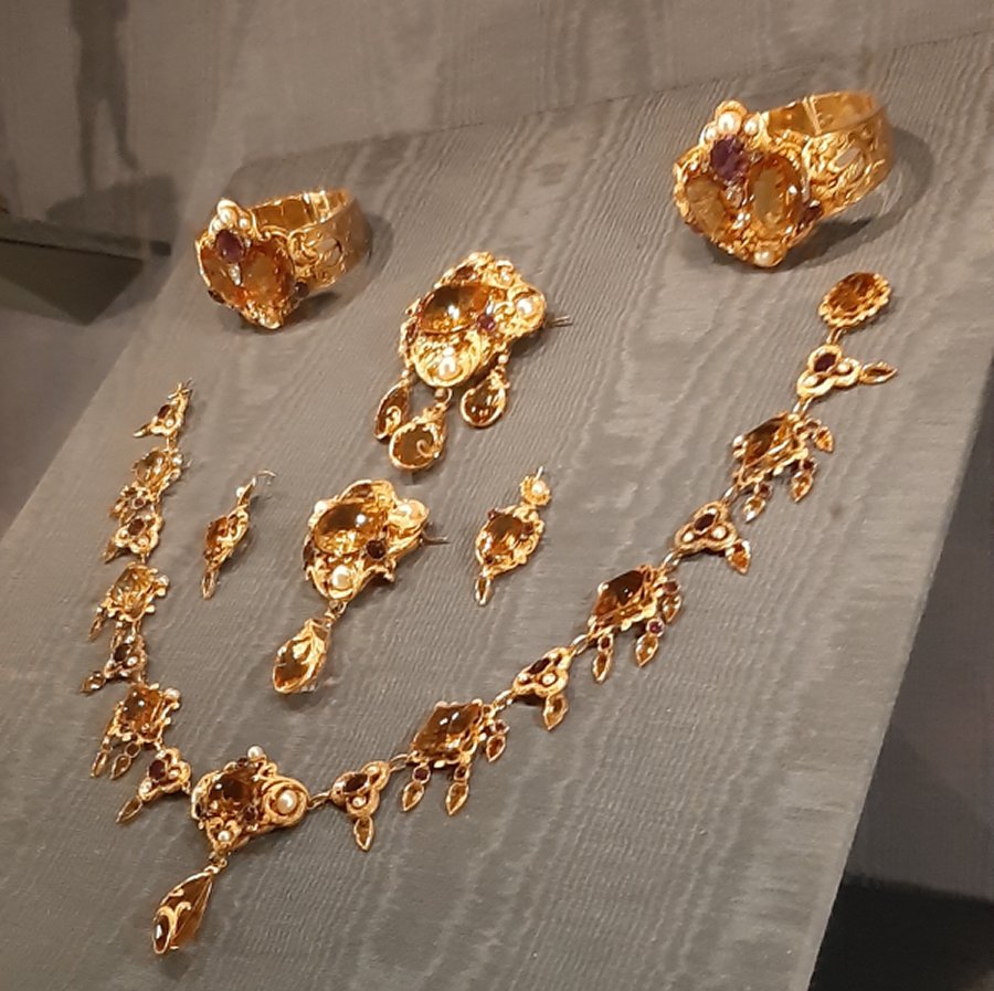 The brooch belonged to Countess Danner herself. It’s part of a citrine parure, made by Danish court jeweler Julius Diderichsen. The set was a gift from King Frederik VII to Louise, possibly to celebrate her birthday in 1860. The suite includes a necklace, earrings, two bracelets, and two brooches. It was not retained by the royal family after her death, but the jewelry historian Trond Noren Isaksen explains the path that led it back to Rosenborg Castle, where it is now displayed alongside the Danish crown jewels: “On March 26, 1982, the citrine parure was purchased at an auction in Stockholm by the New Carlsberg Foundation, which has placed it on permanent loan to the Royal Collections.”